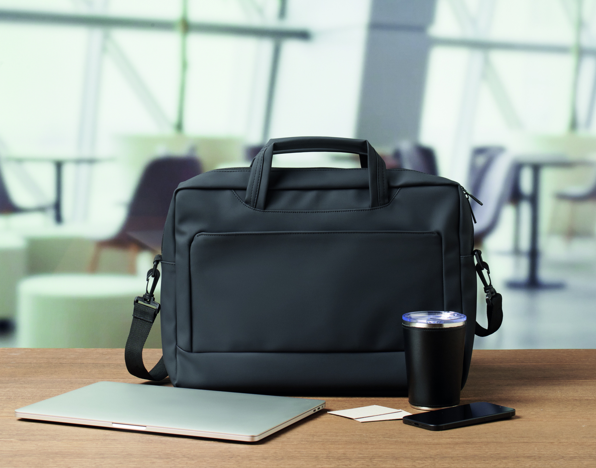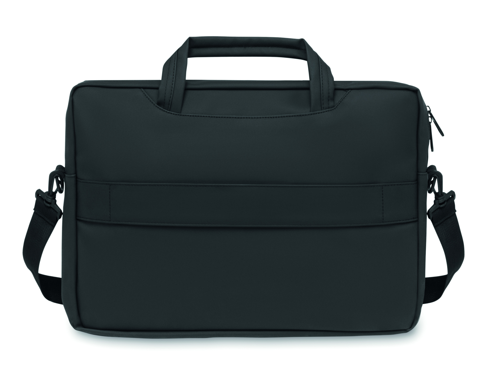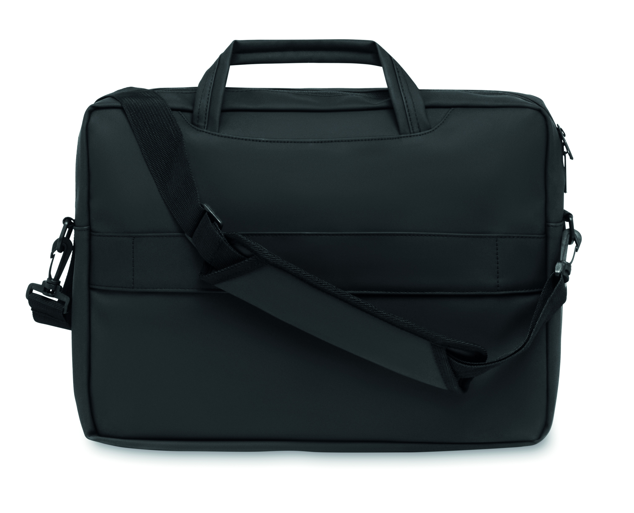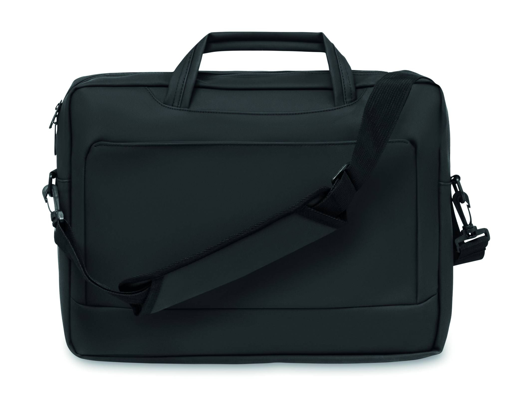 15'' Laptop Tasche aus weichem PU. Inkl. gepolstertes Laptop-Fach, Fronttasche mit Reißverschluss und diverse Fächer. Futter 210D RPET-Polyester. 2 Griffe, abnehmbarer und verstellbarer Schultergurt. Rückseitige Trolley-Halterung.