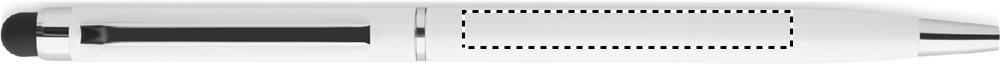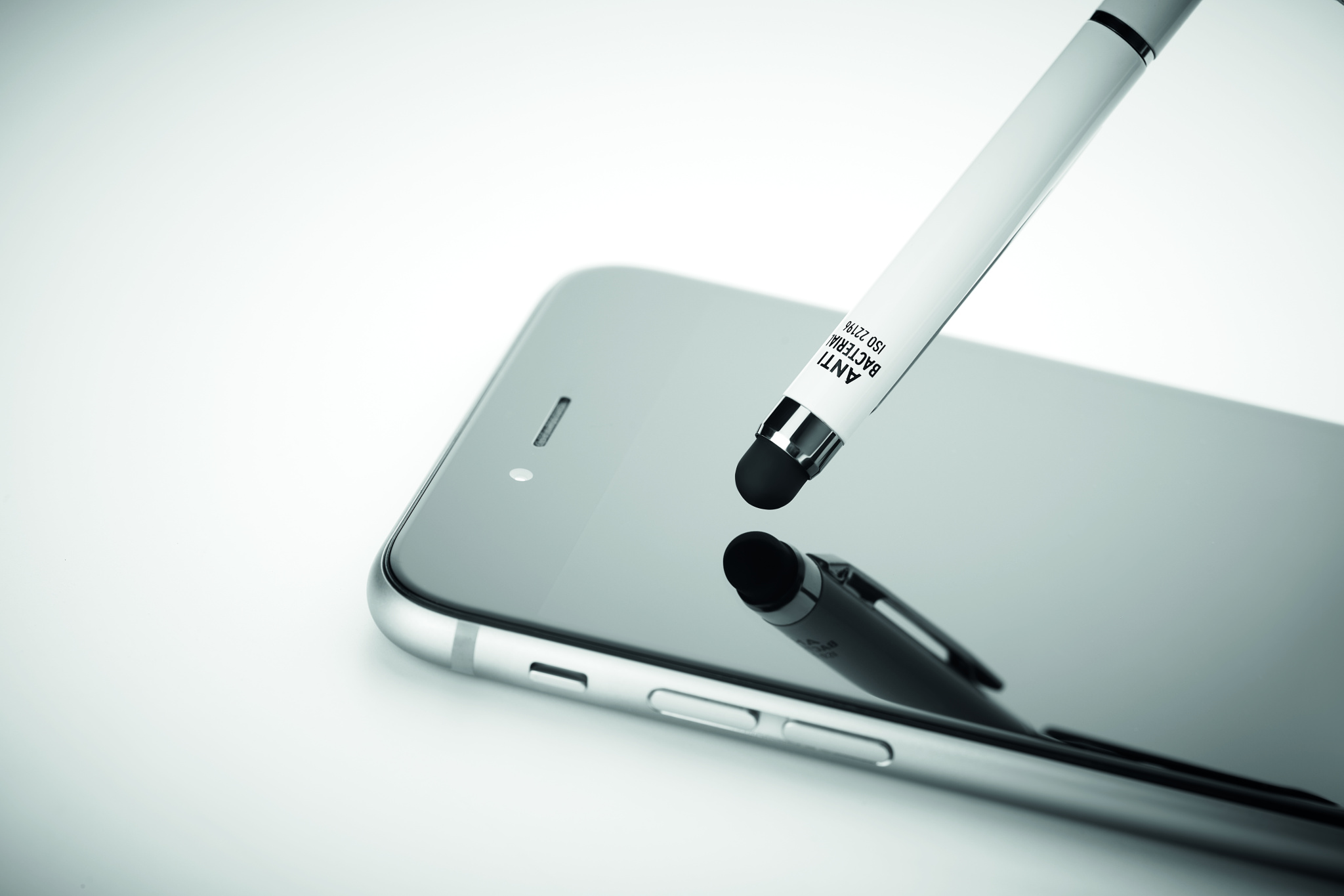 Drehkugelschreiber mit Stylus aus Aluminium. Antibakterieller Schaft. Glänzend verchromter Clip. ISO 22196. Blaue Tinte.