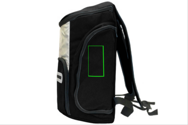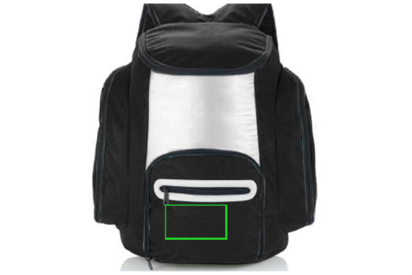 600D Kühltaschenrucksack mit silberner Innenseite damit Essen und Getränke frisch und gekühlt bleiben. Auf der Vorderseite befindet sich noch eine weitere Tasche mit farbigen Details, die mit einem Reißverschluss geschlossen wird für alle anderen Kleinigkeiten.
