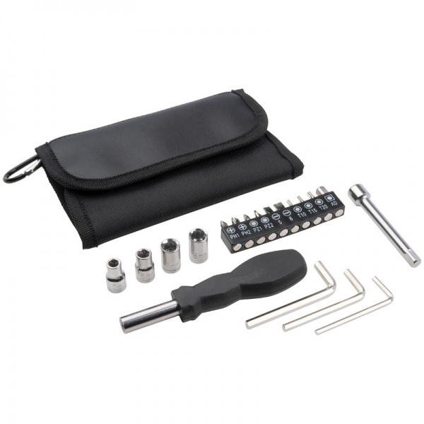 Das Werkzeugset besteht aus einem Schraubendreher mit verschiedenen Nüssen und Bits, einem Verlängerungsstück und drei Sechskantschlüsseln in unterschiedlichen Größen sowie einer praktischen Tasche mit Karabinerhaken, auf die wir Ihr Logo drucken. Das Set ist einzeln im Polybeutel verpackt.
