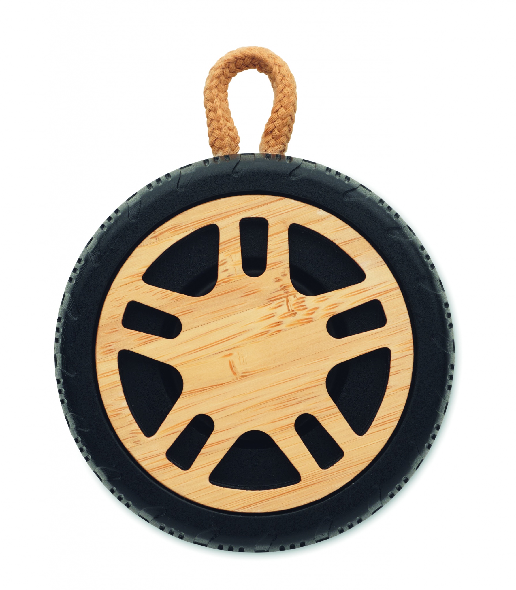 5.3 wireless Lautsprecher (3W) in Optik eines Autoreifens. Recyceltes ABS mit Details aus Bambus. Handschlaufe aus Baumwolle. Inkl. 1 wiederaufladbare 400-mAh-Batterie.