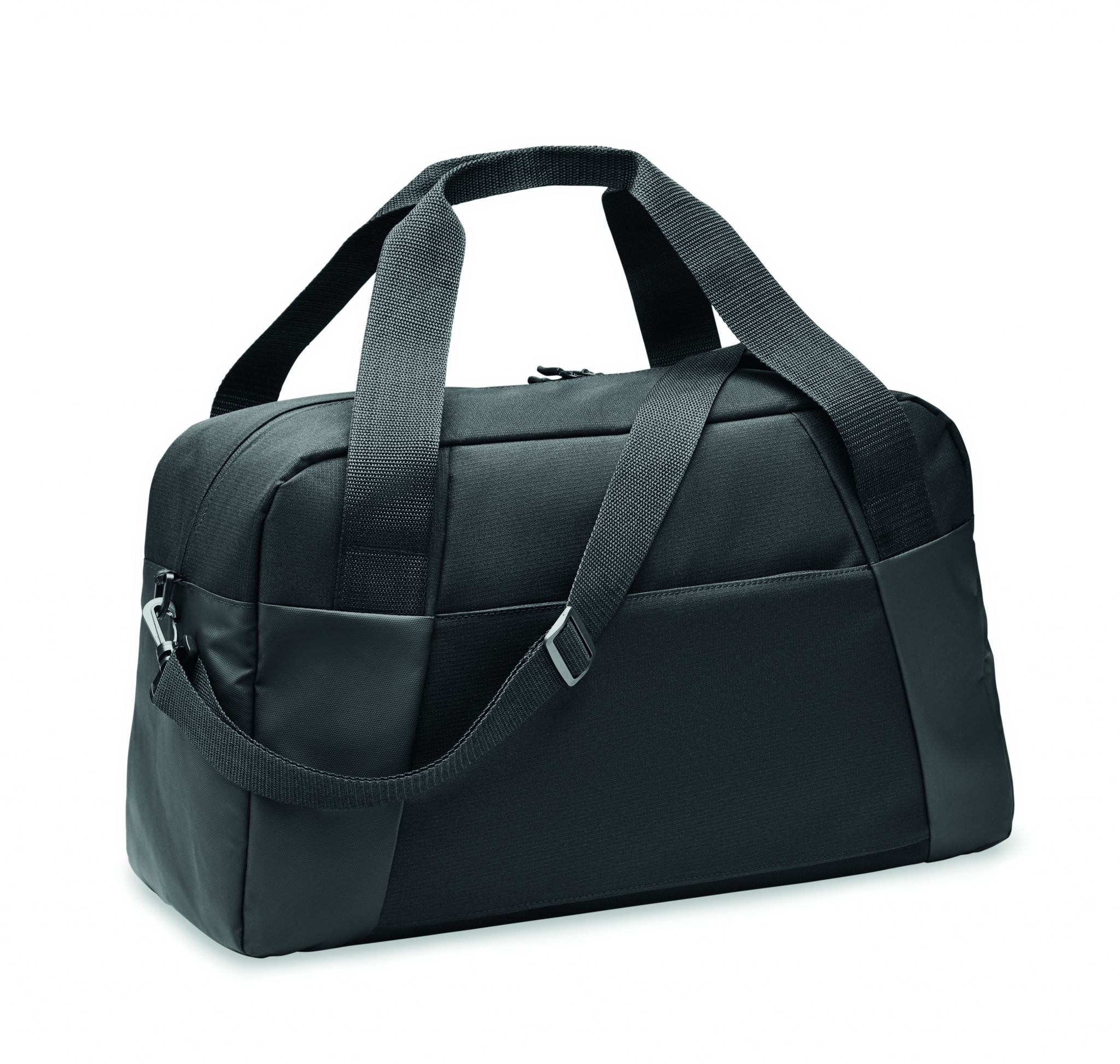 Travel or sports bag in 300D ripstop with PU details with front zippered pocket. It has an inside pocket and 2 small padded compartments. Trolley holder on back side.