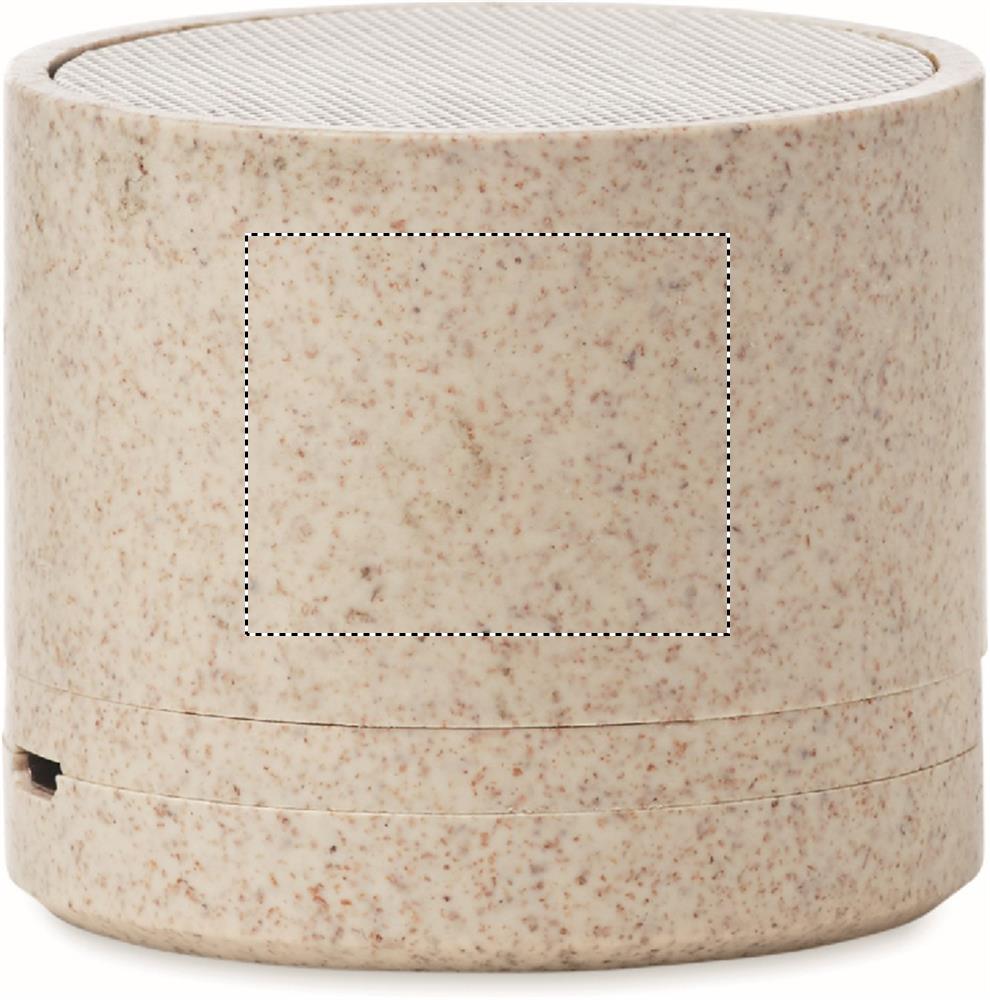 5.0 wireless speaker in wheat straw (35%) and ABS(65%) and LED light indication. 1 Rechargeable Lithium 300 mAh battery included. Output data: 3W, 3 Ohm and 5V. Playing time approx. 2h.