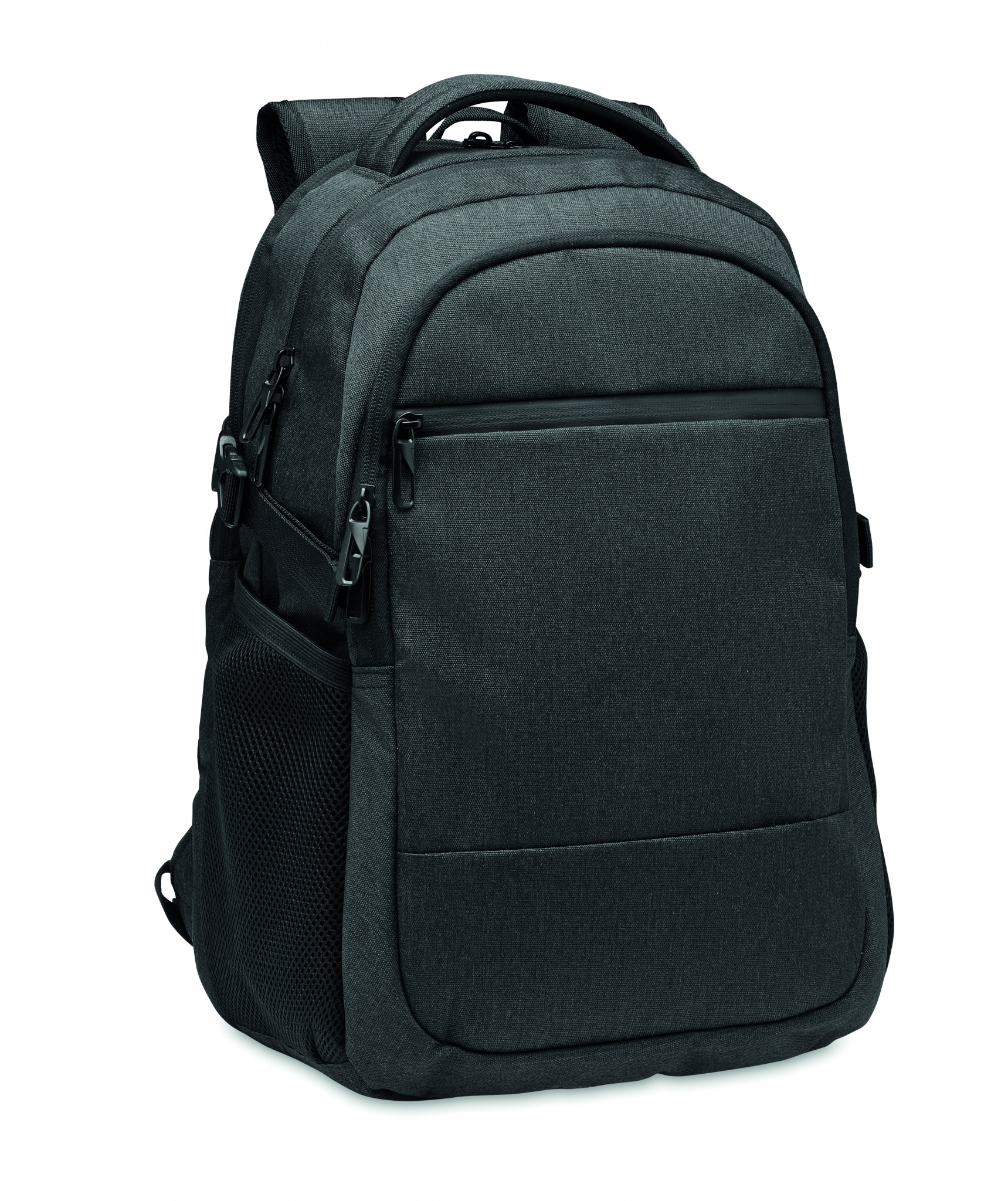 15 inch laptop backpack in 600D RPET polyester. 3 large zippered external compartments fully padded with several inside pockets. It has two mesh side pockets. Adjustable shoulder straps. Padded mesh airflow and trolley holder on reverse side.