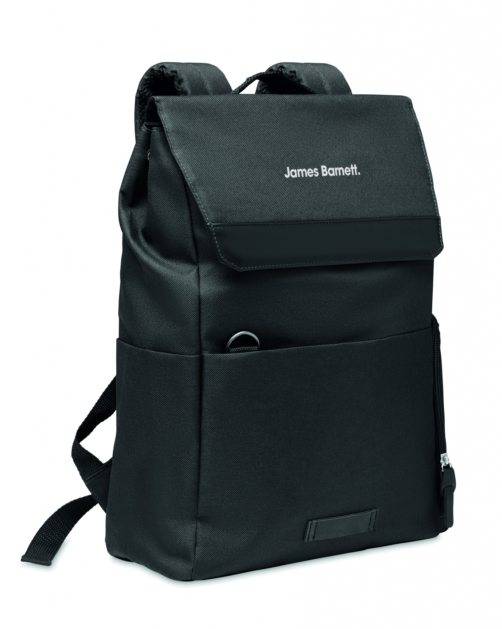 600D 2 tone RPET 15 inch laptop backpack with magnetic snap button. Padded laptop compartment, front zippered pockets and 2 side pockets.