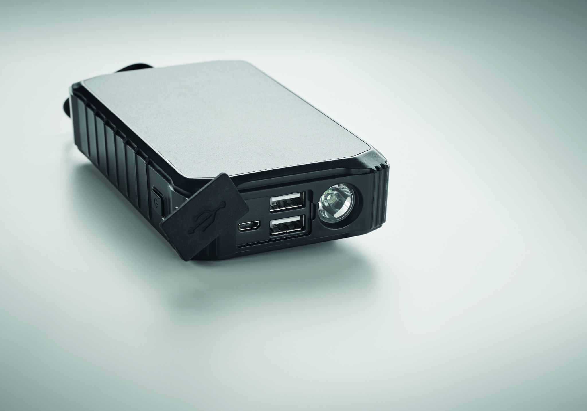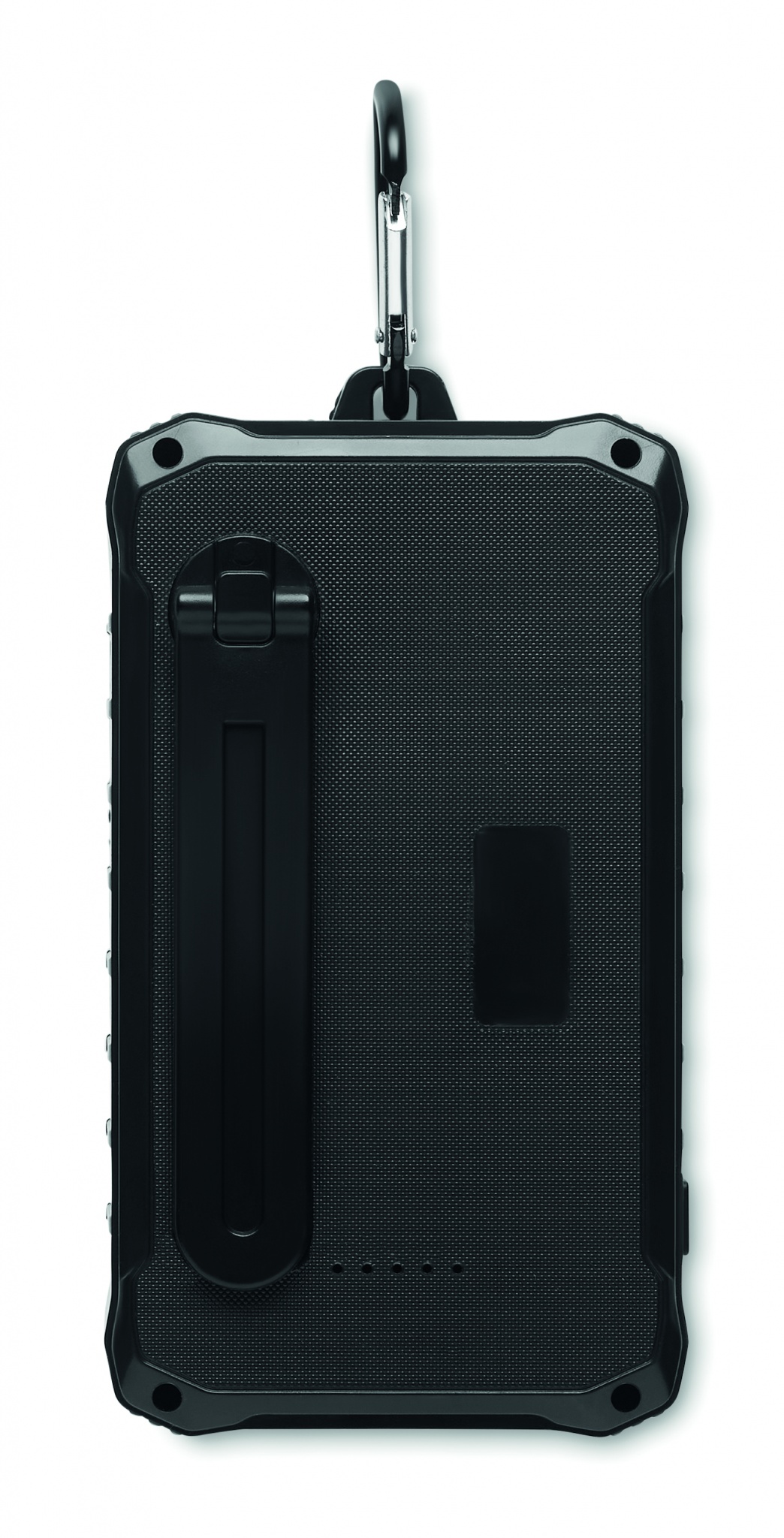 Solar power bank 8000 mAh with hand crank dynamo. Includes 1 LED light and 100 lumens. Type C input/output, 2 USB-A output. Output current DC 5V/2.1A.