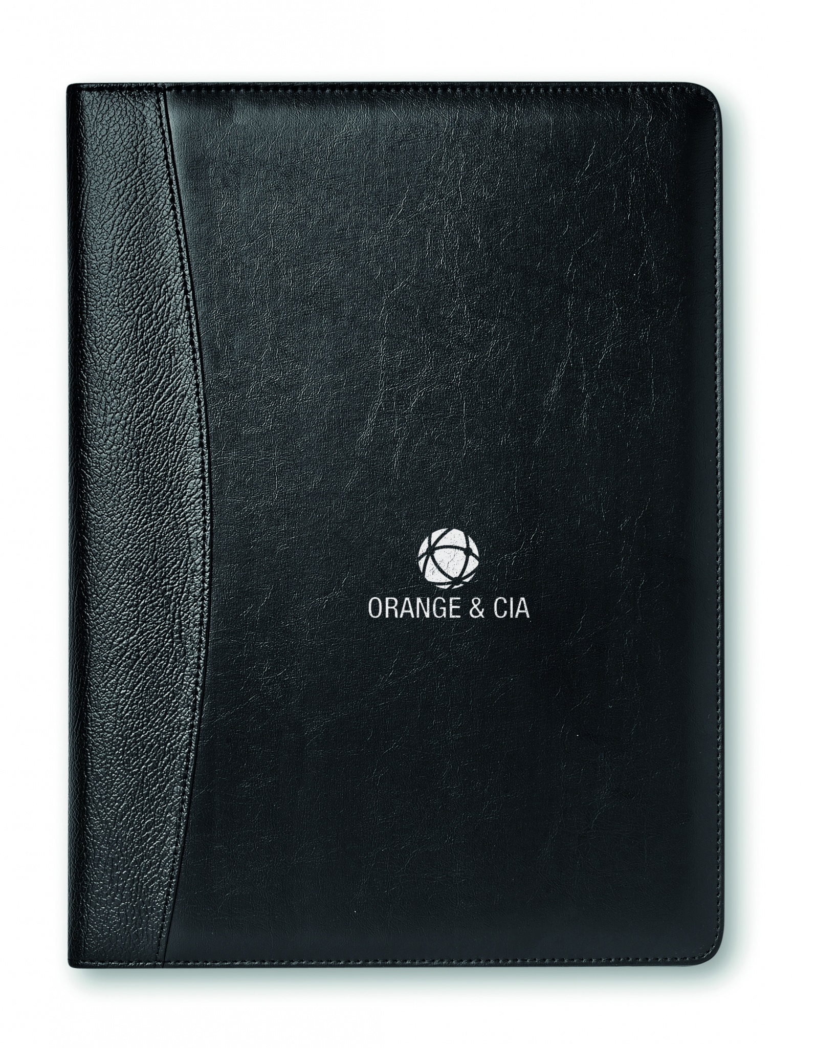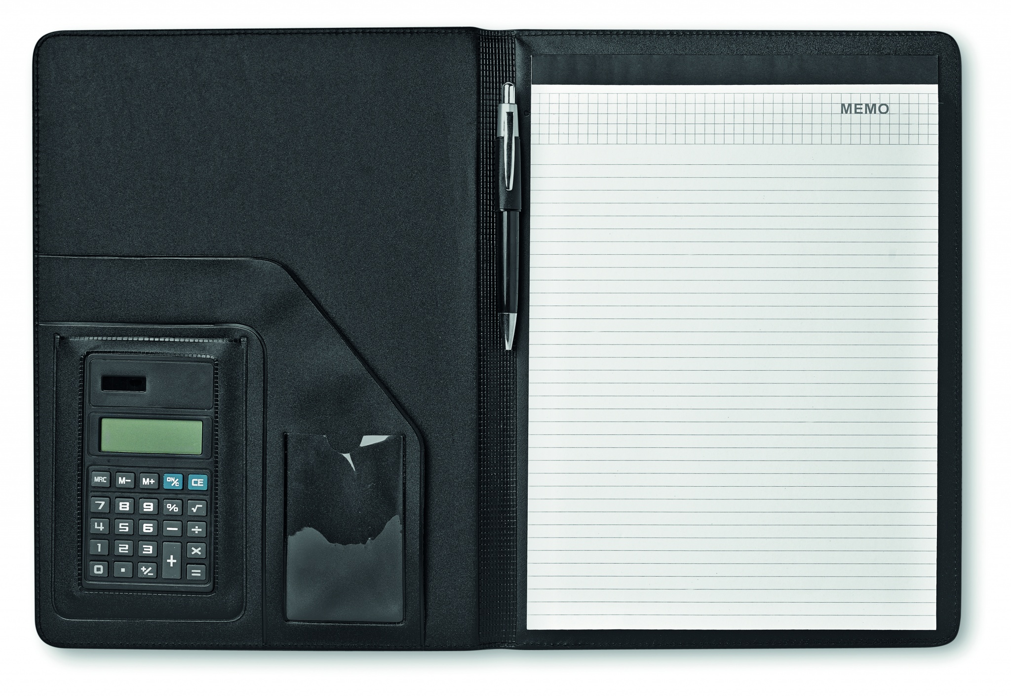 A4 faux leather portfolio. 20 lined sheets notepad. Solar powered calculator. Metal ball pen. Blue ink.