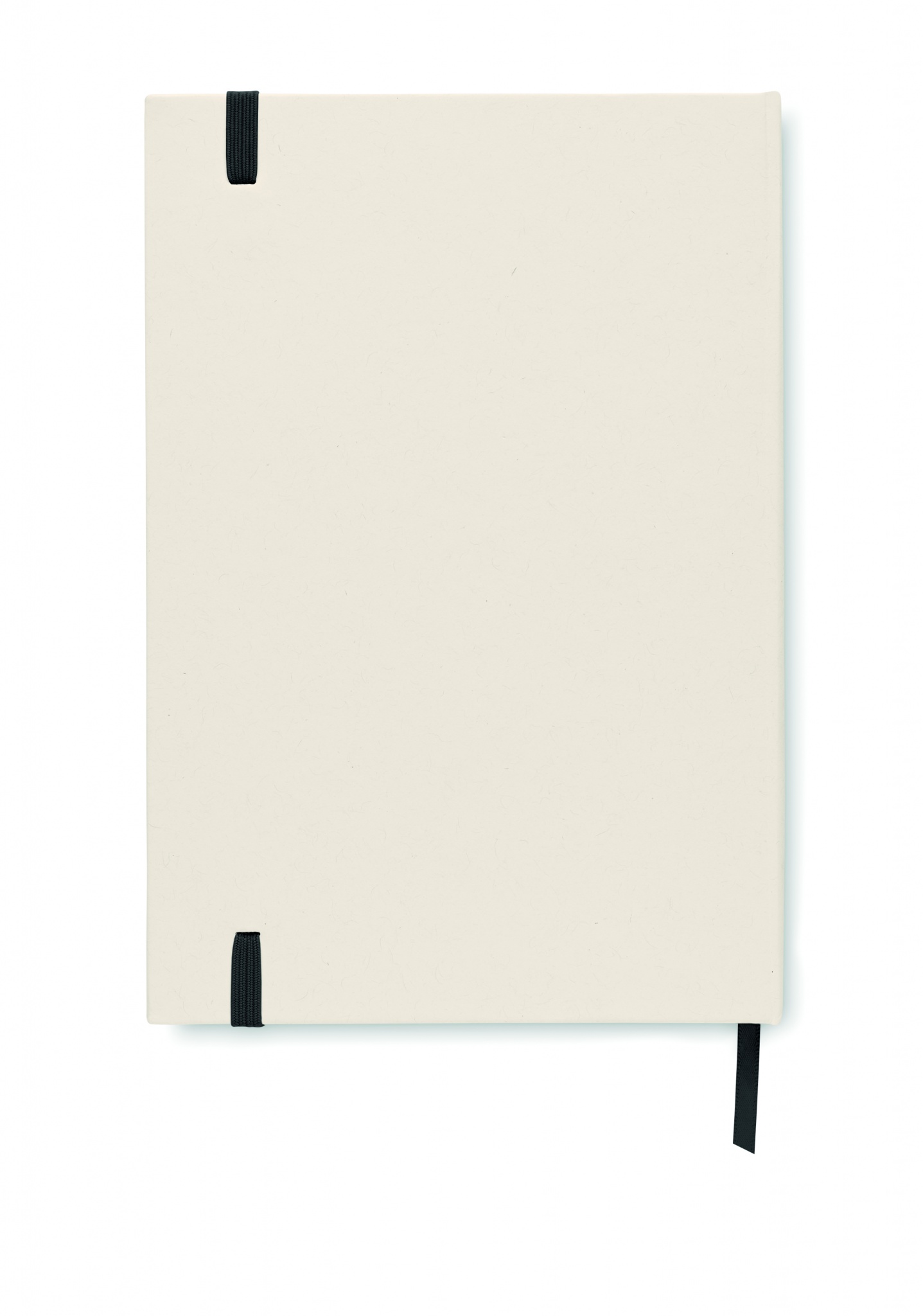 A5 notebook with hard cover made of 70% recycled milk carton pack and 30% recycled paper. Casebound. 160 lined pages (80 sheets 80 gsm) made of recycled paper. Elastic closure strap, ribbon bookmark.