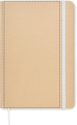 A5 notebook with hard recycled carton cover. Casebound. 160 squared recycled pages (80 sheets). Elastic closure strap, ribbon bookmark.