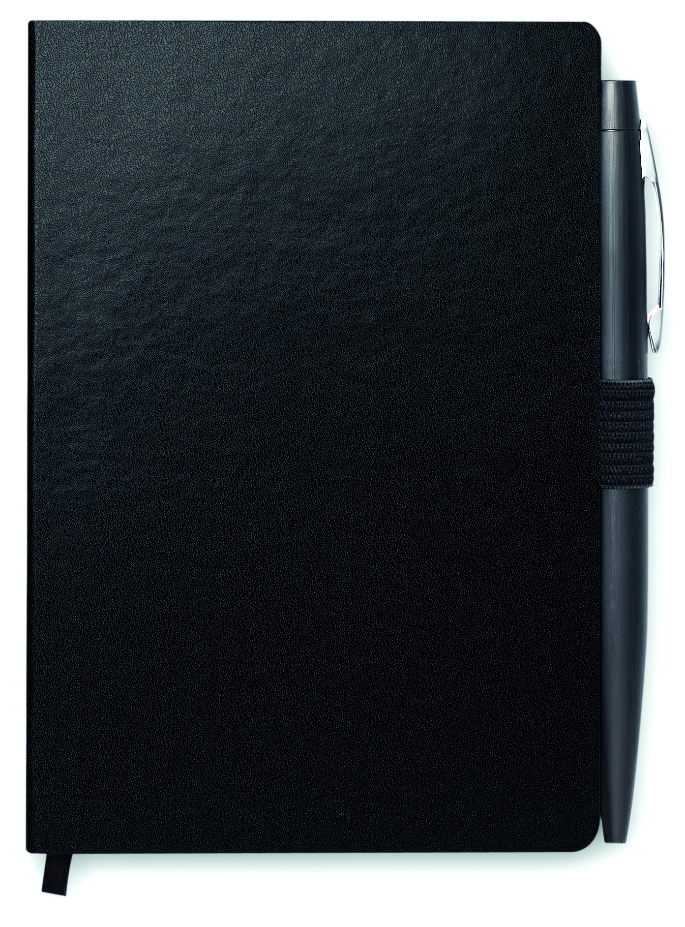 A6 notebook with pen. Hard PU cover. Casebound. 144 lined pages (72 sheets). Matching elastic closure strap, ribbon bookmark and pen holder. Matching metal push button ball pen. Blue ink.
