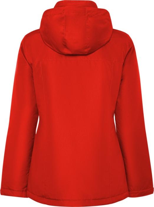 Waterproof padded parka jacket for women. Slim-fit. High collar with folded and removable hood with hook & loop closure. Matching central zipper with flap. Side pockets with zipper and fixed flap. Interior pocket with hook & loop closure. Adjustable cuffs with hook & loop belt loop. Interior access for reinforcements on the back and left chest.