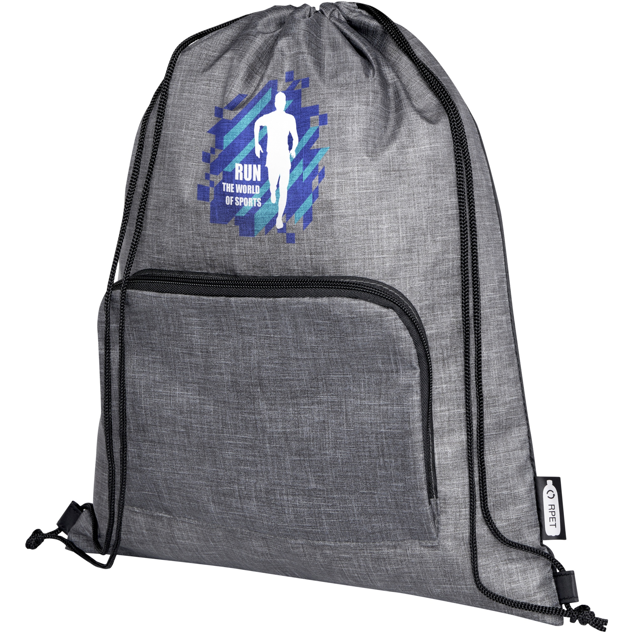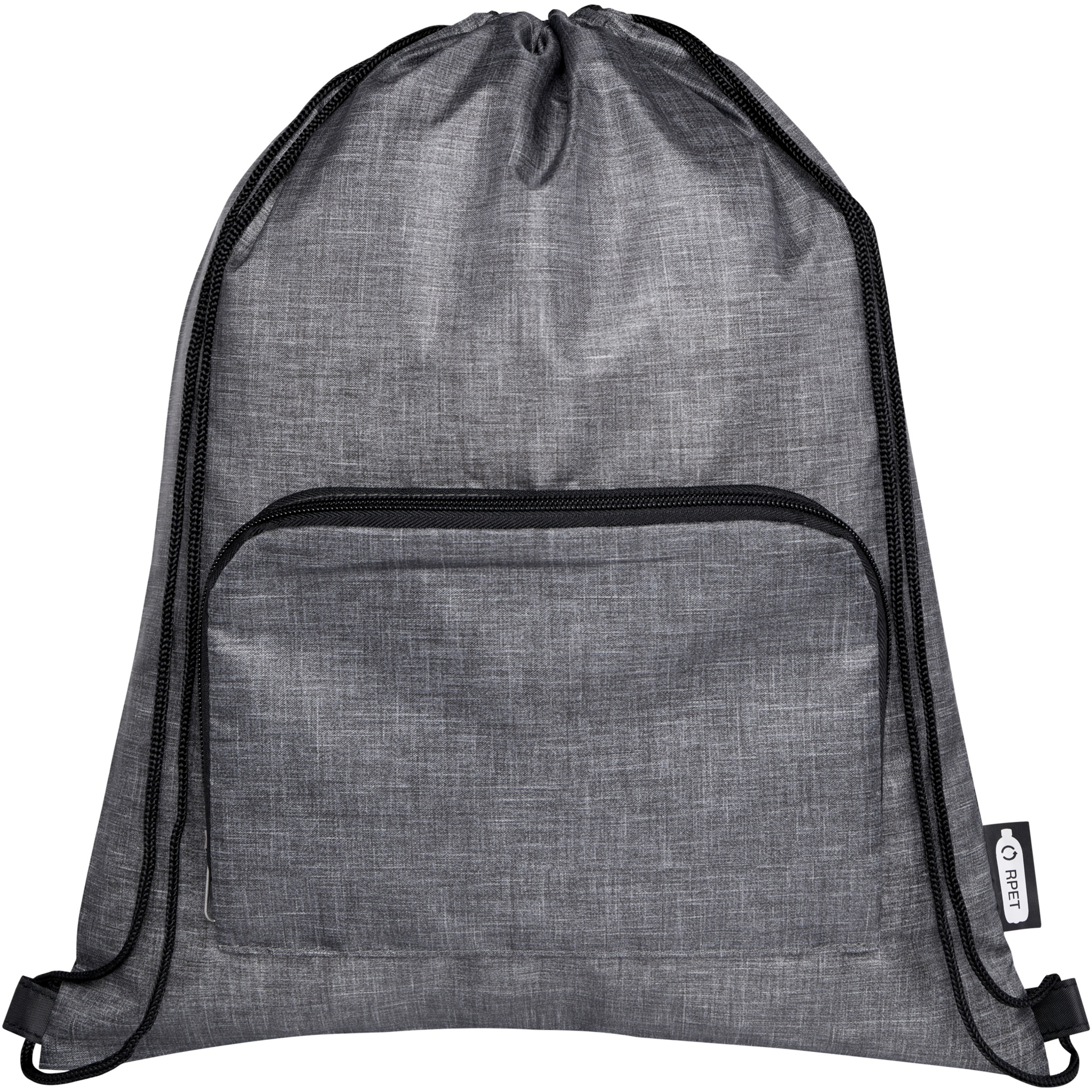 The Ash foldable recycled drawstring bag features a main compartment with cinch closure, and a zippered front pocket that the bag can easily fold up into for easy transport and storage.