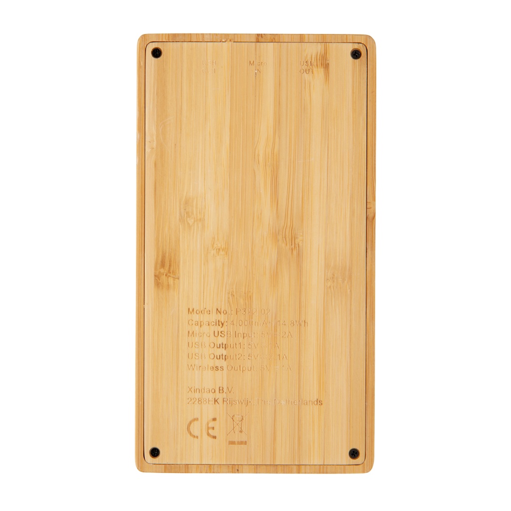 Eco 4.000 mAh powerbank made out of natural and sustainable bamboo. Supports 5W wireless charging and charging via USB port by cable. When fully charged it will provide you with enough energy to re-charge your mobile phone up to two times. The powerbank contains a long-lasting grade A 4.000 mAh high-density lithium polymer battery. The power indicators will indicate the remaining energy level so you always know when to re-charge. Input 5V/2A. USB Output 5V/2A. Wireless Output 5W 5V/1A.