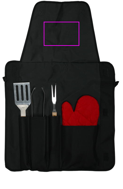 Nylon apron with grill glove, stainless steel fork, tongs and turner with wooden handle. We print your logo on the apron.