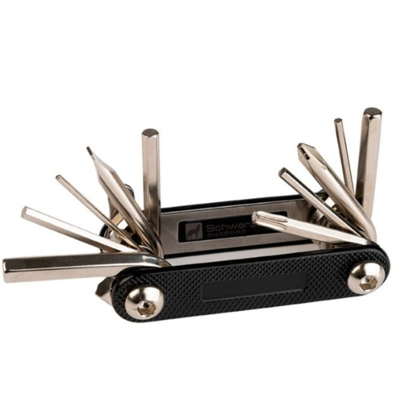 Practical tools set for bikers. Includes bike repair multitool and a loop. Packed in a Schwarzwolf box.
