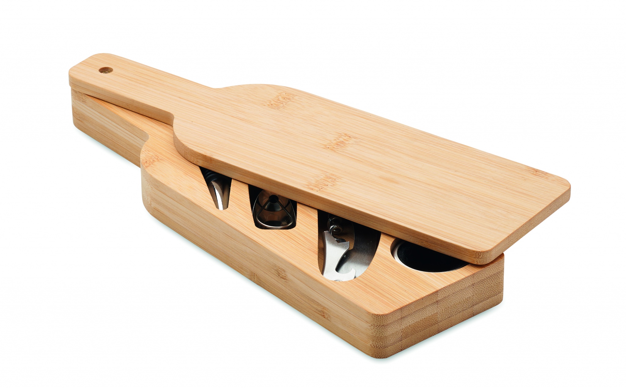 Bottle shape wine set in bamboo case. Including corkscrew, wine pourer, bottle stopper and wine bottle drip ring.