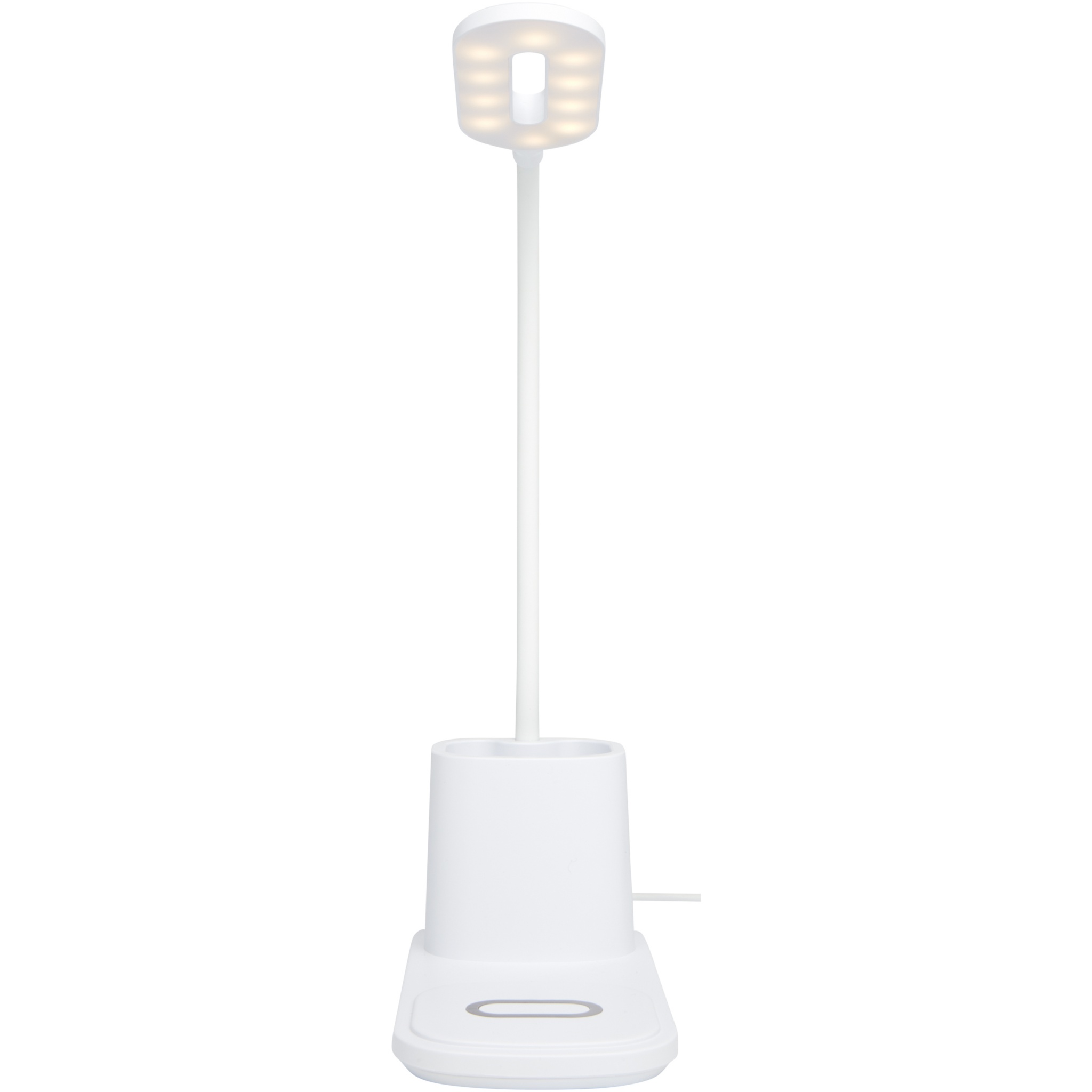 Desk lamp with an integrated wireless charger and pencil holder. The lamp has 3 lightning settings (warm/cold/medium) and can be adjusted in height. The charger has 10W wireless output and is compatible with all Qi devices (iPhone 8 or above and Android devices that supports wireless charging).