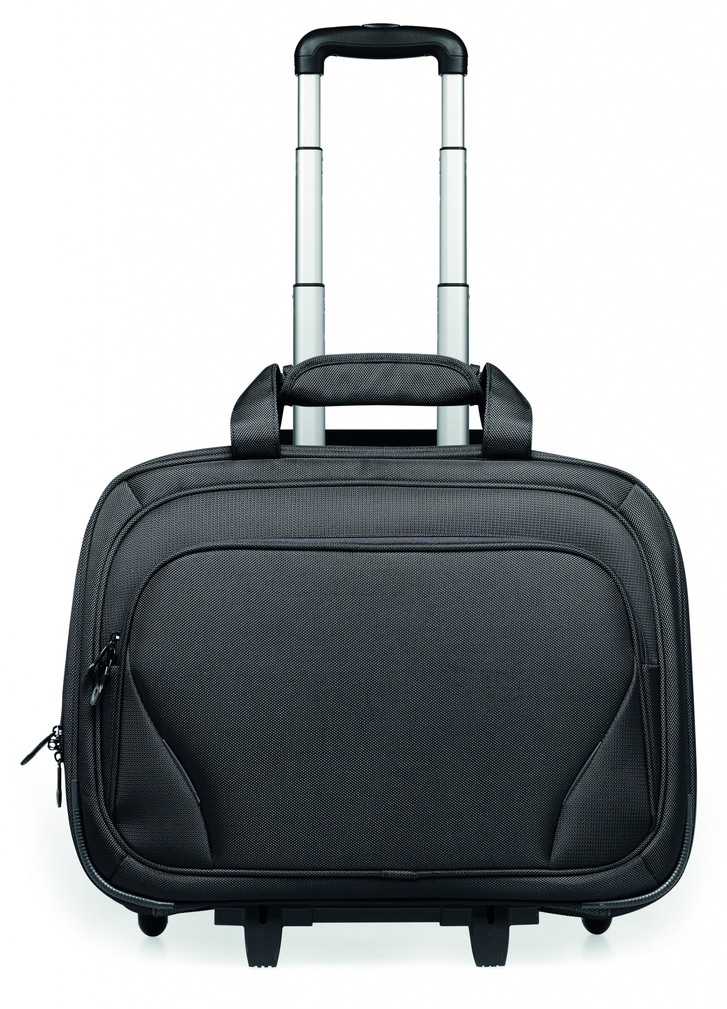 Business trolley including a 17 inch laptop pocket and 10 inch tablet pocket with several compartments. 1680D polyester.