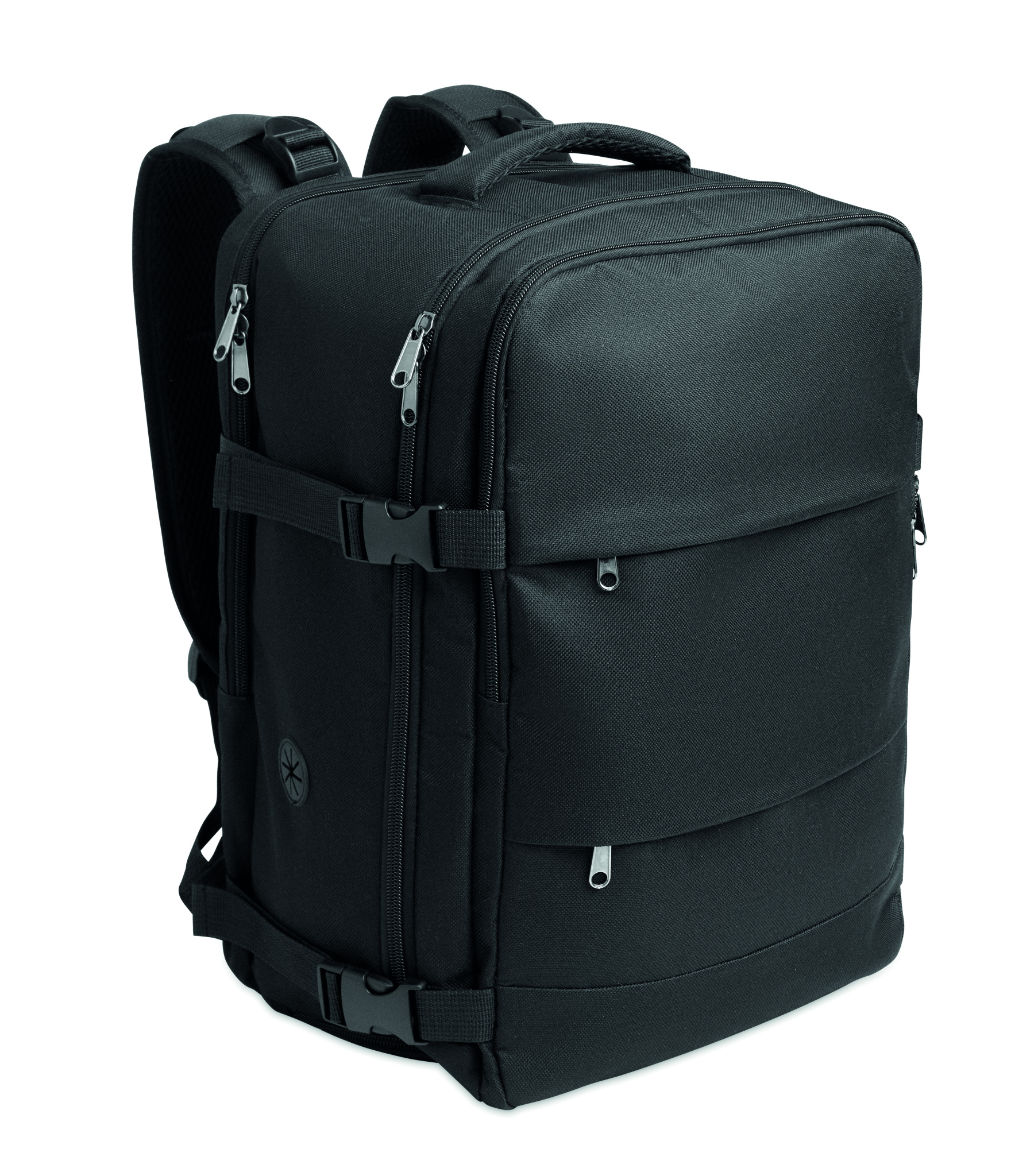 Cabin-size extendable backpack in 600D RPET polyester with PU backing and 180o opening. Includes shoe division, padded 15'' '' laptop pocket, mesh straps, luggage strap, and side buckles.