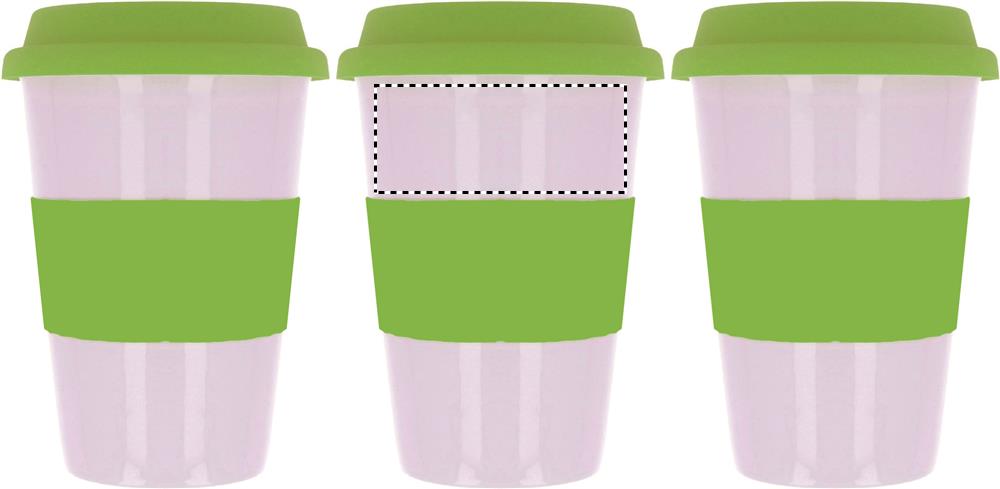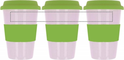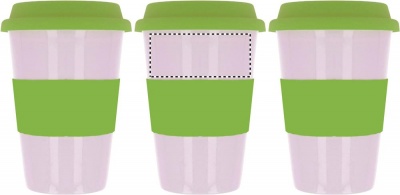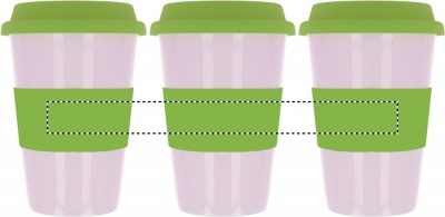 Single walled ceramic mug with silicone lid and wrap band. 400ml capacity. Ceramic transfer is dishwasher safe. As this is a single walled mug heat transfer can still occur.