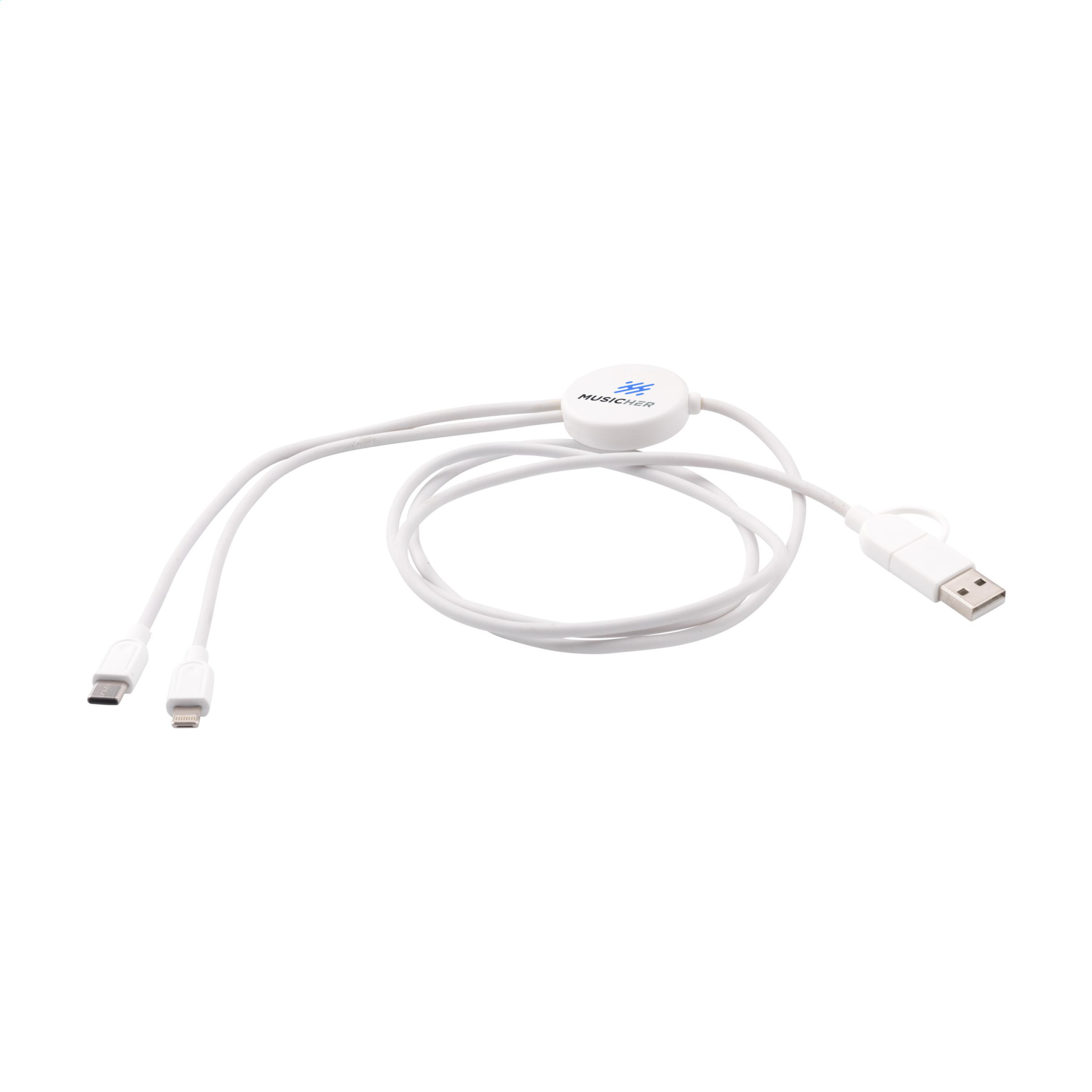 Charging cable made from recycled ABS and recycled TPE. Input: Type-C and USB-A connector. Output: Type-C and Lightning. RCS-certified. Total recycled material: 62%. Cable length: 120 cm. Each item supplied in an individual envelope.