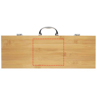 Bamboo 5-piece BBQ set with a shovel (40 x 9.5 cm), tong (34.5 x 6 cm), fork (38.5 x 3 cm), knife (38.5 x 3 cm), and brush (38 x 4.3 cm). The set is delivered in a bamboo gift box (46 x 16.2 x 7.4 cm). The handles and gift box are made of bamboo that is sourced and produced following sustainable standards.