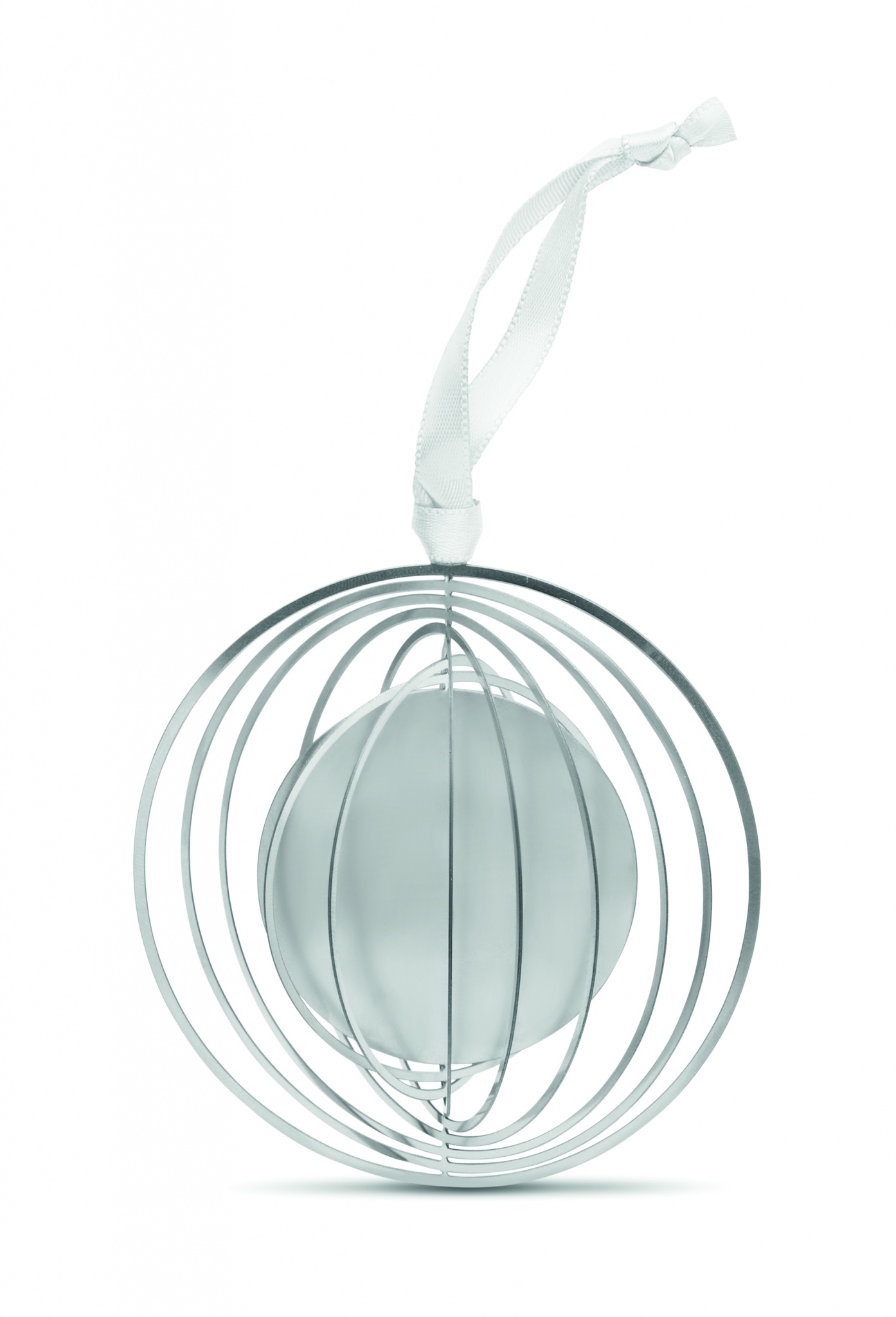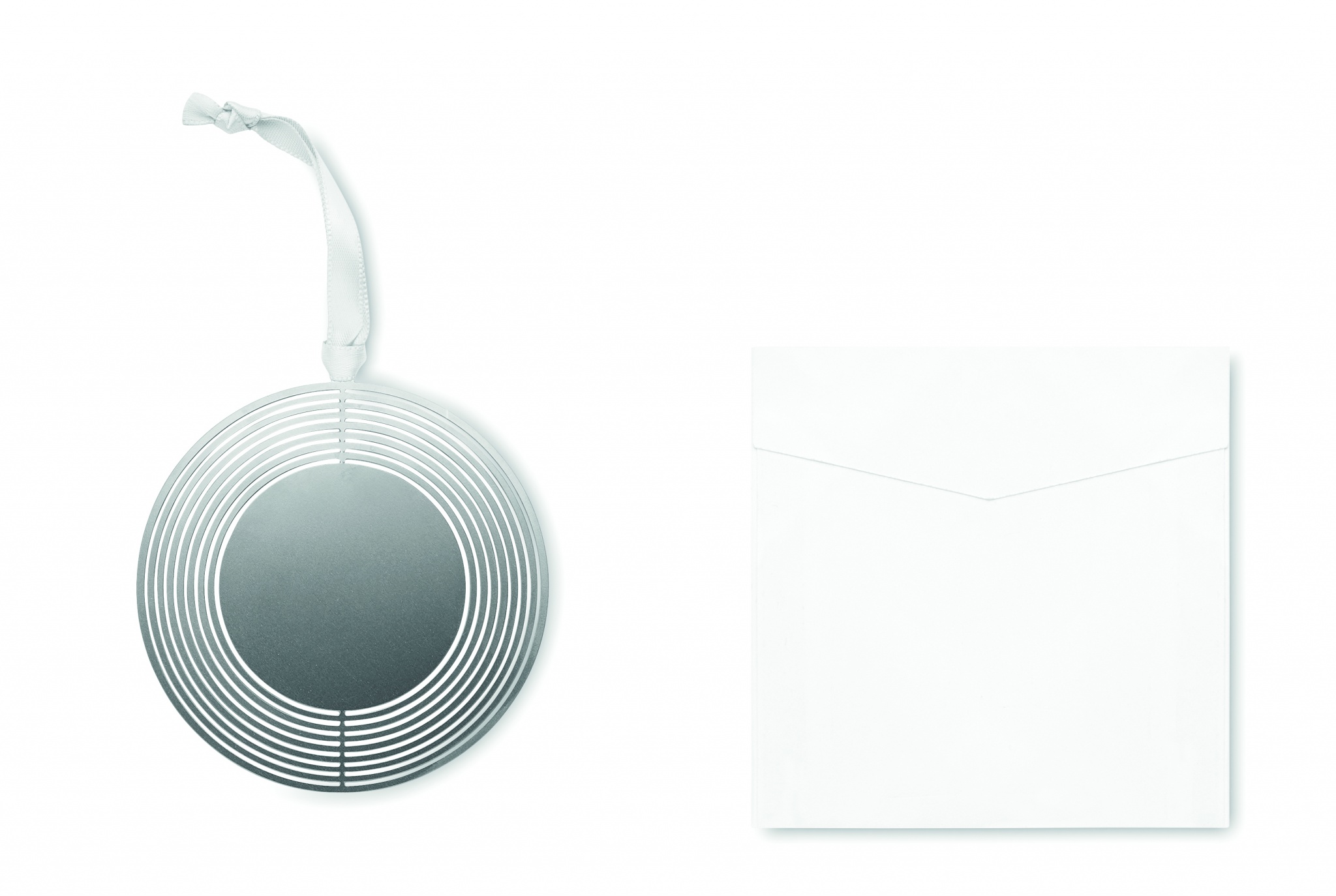Circular shaped decorative ornament in stainless steel with ribbon in gift envelope. Easily folds flat for mailing and storage.