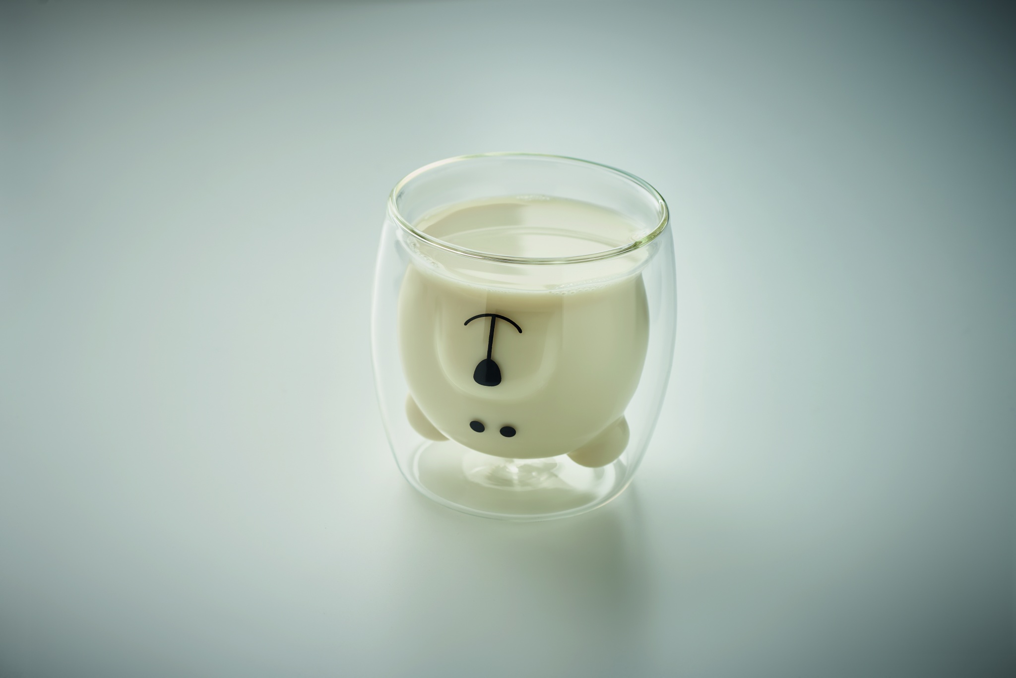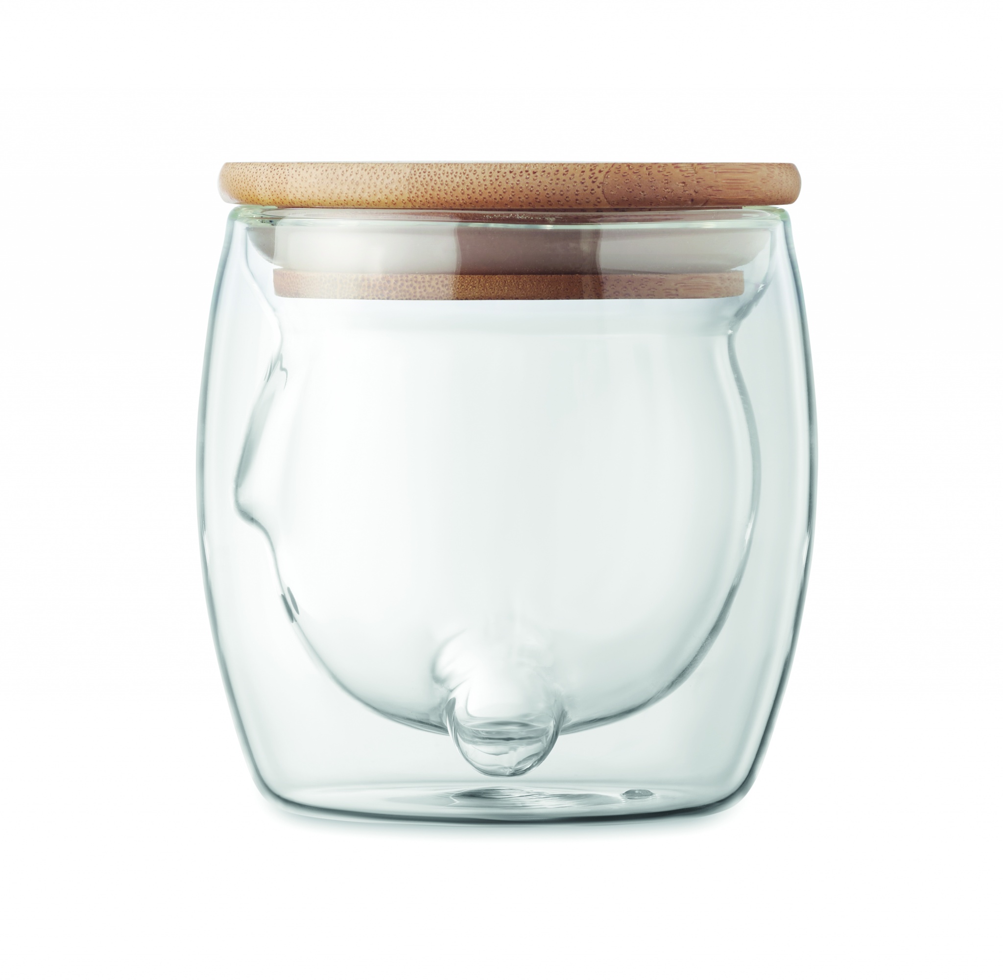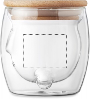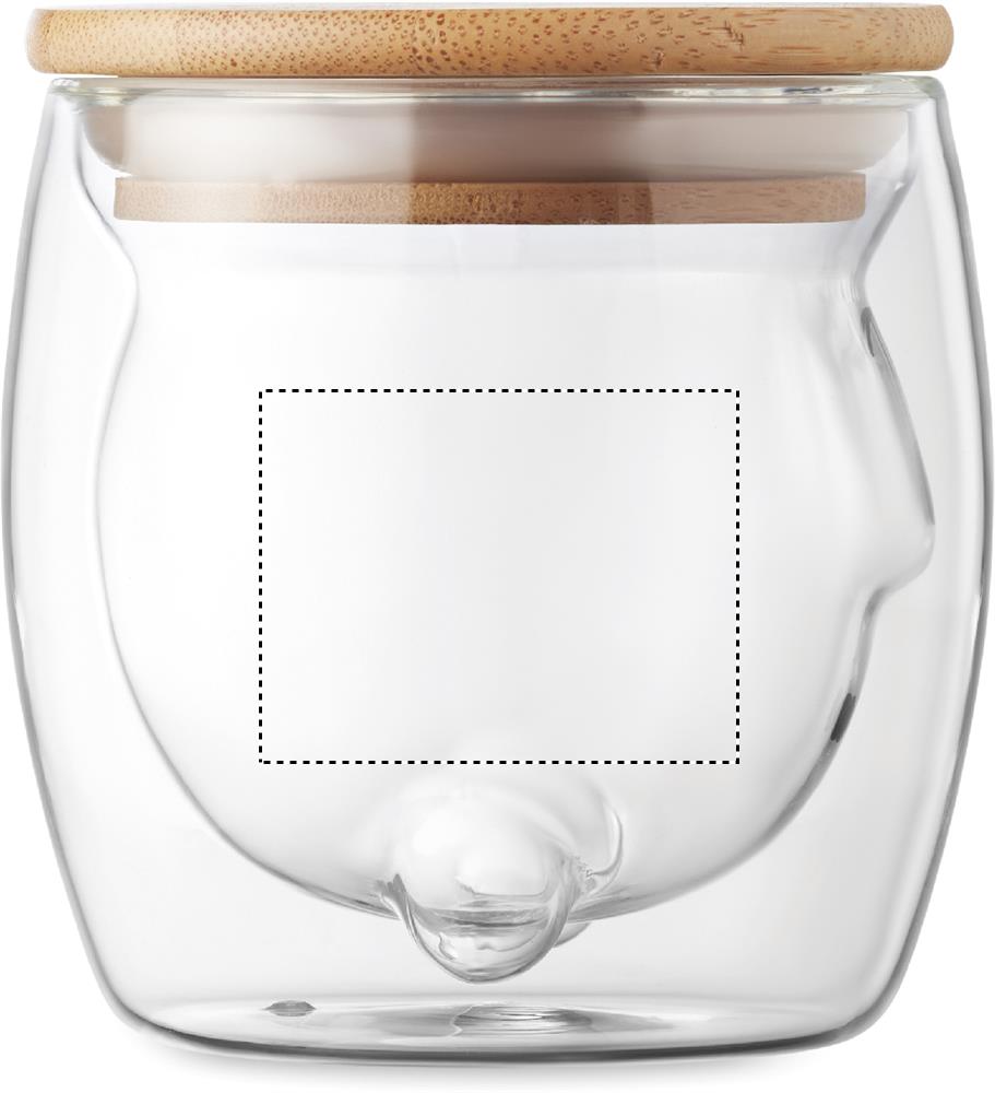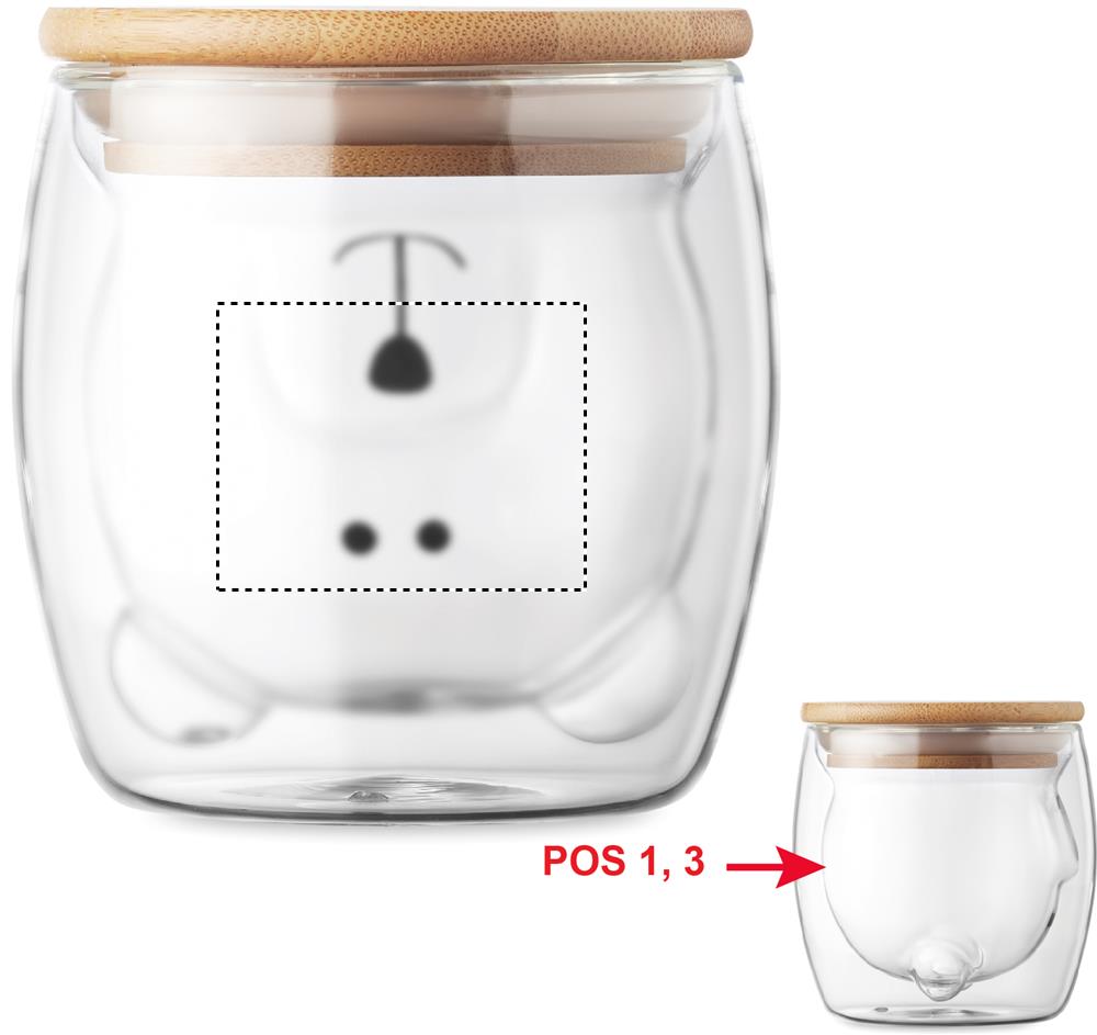Double wall borosilicate glass mug with bear face design and bamboo lid. Capacity: 260ml. Bamboo is a natural product, there may be slight variations in colour and size per item, which can affect the final decoration outcome.