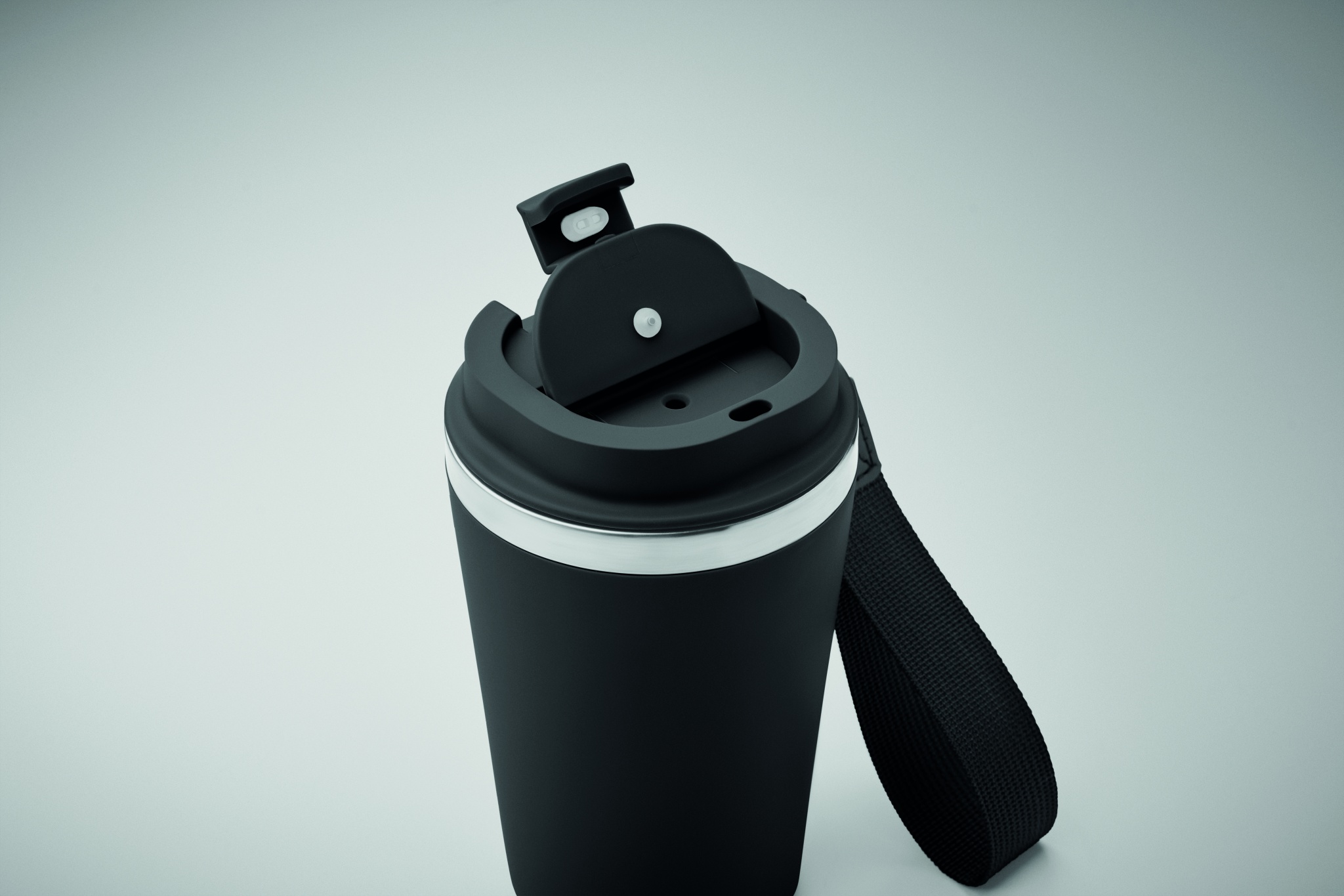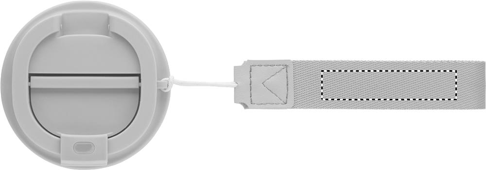 Double wall tumbler in recycled stainless steel (90% recycled stainless steel and 10% stainless steel) with recycled PP outside layer with RPET wrist strap. Leak-free. Capacity: 350 ml.