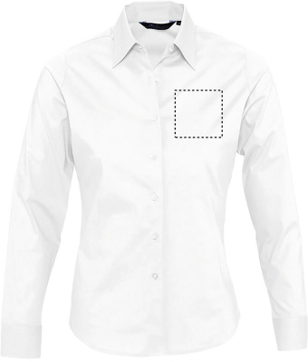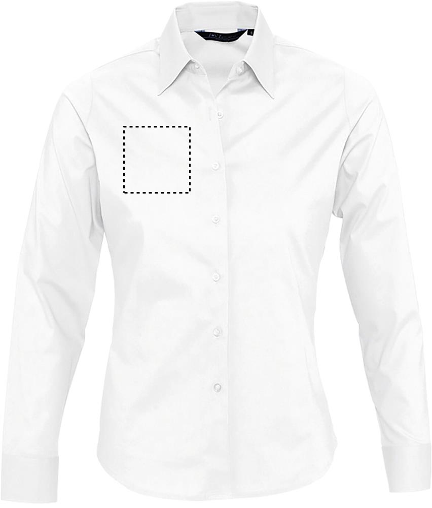 SOL'S EDEN women shirt 140g. Made out of cotton elastane, with a close-fitting cut, it provides a pleasant ironed look and comfort. Very fashionable product. Close-fitting cut. Long sleeves. Single button collar. Adjustable cuffs with 2 buttons and bound slit. 7 tone-on-tone button placket. Front and back darts. Fabric details: 97% cotton - 3% elastane. OEKO-TEX®. Only Sold with Print.