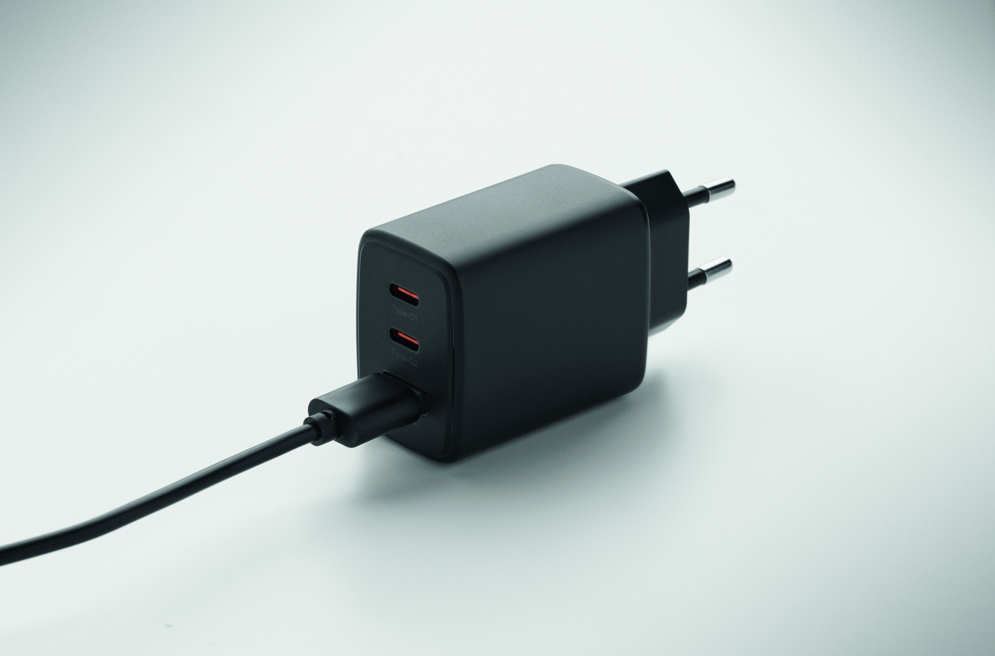 EU 2-pole GaN wall charger with 65W quick charge, 1 USB-A and 1 Type-C ports. Supports Power Delivery technology. Ideal travel item.