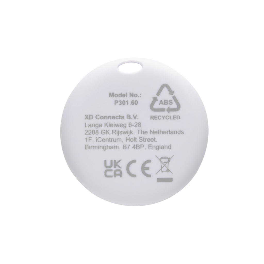 Keep track of your favourite items, no matter where in the world you are with this recycled ABS item finder. Attach the item finder to your wallet, key or add it to a bag, luggage or even your pet to locate it easily using the Apple Find My App. Compatible with all Apple devices (iphone, ipad, iwatch, MAC) With lost mode to notify you when you are leaving your belongings. With integrated beeping signal via speaker to find your devices when you are near. Battery life depending on usage up to 1 year, after that the CR2032 can be replaced. Packed in plastic-free FSC mix box. Total recycled content: 50% based on total item weight. RCS certification ensures a completely certified supply chain of the recycled materials. PVC free.