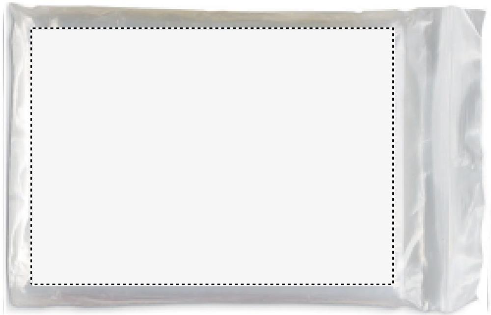 Foldable plastic poncho with attached hood, packed in a transparent polybag.