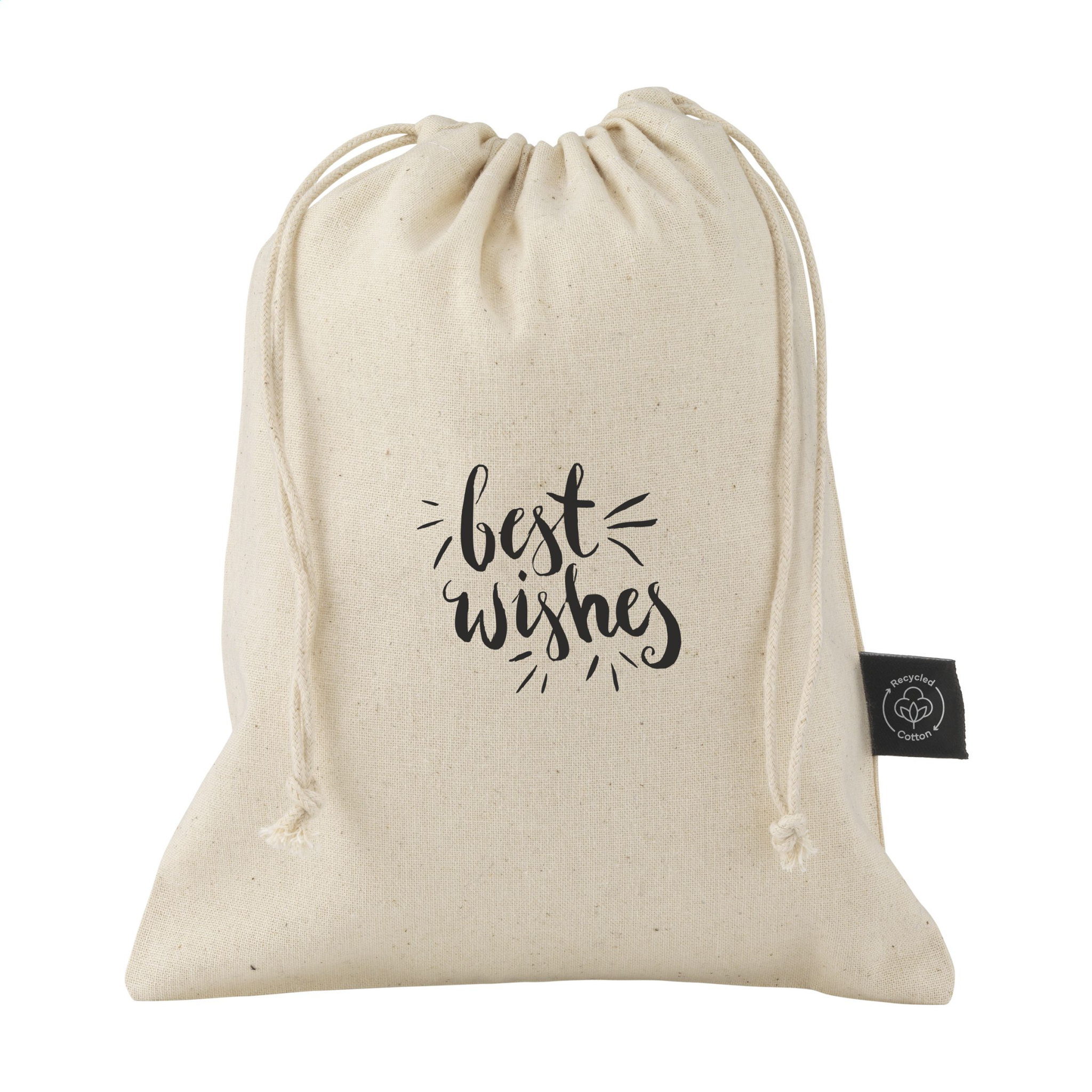 Gift pouch made from recycled cotton (150 g/m²). With drawstrings made from recycled polyester and recycled cotton. Original as gift packaging and suitable for storing items. GRS-certified. Total recycled material: 94%. Capacity approx. 500 ml.