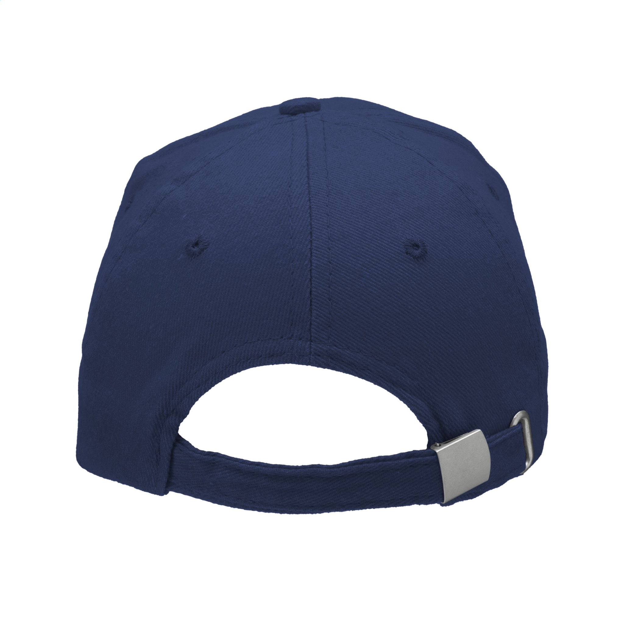 Sturdy baseball cap made from 100% combed high quality cotton, pre-shaped peak and adjustable metal clip fastener at the back.