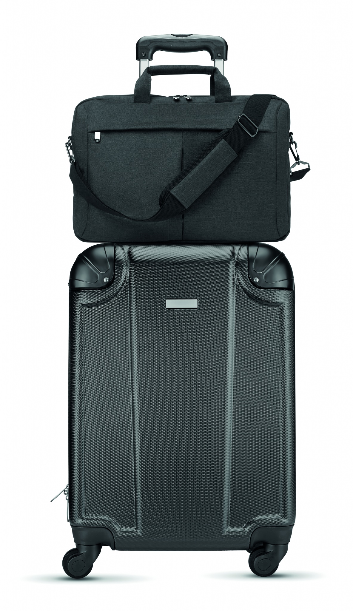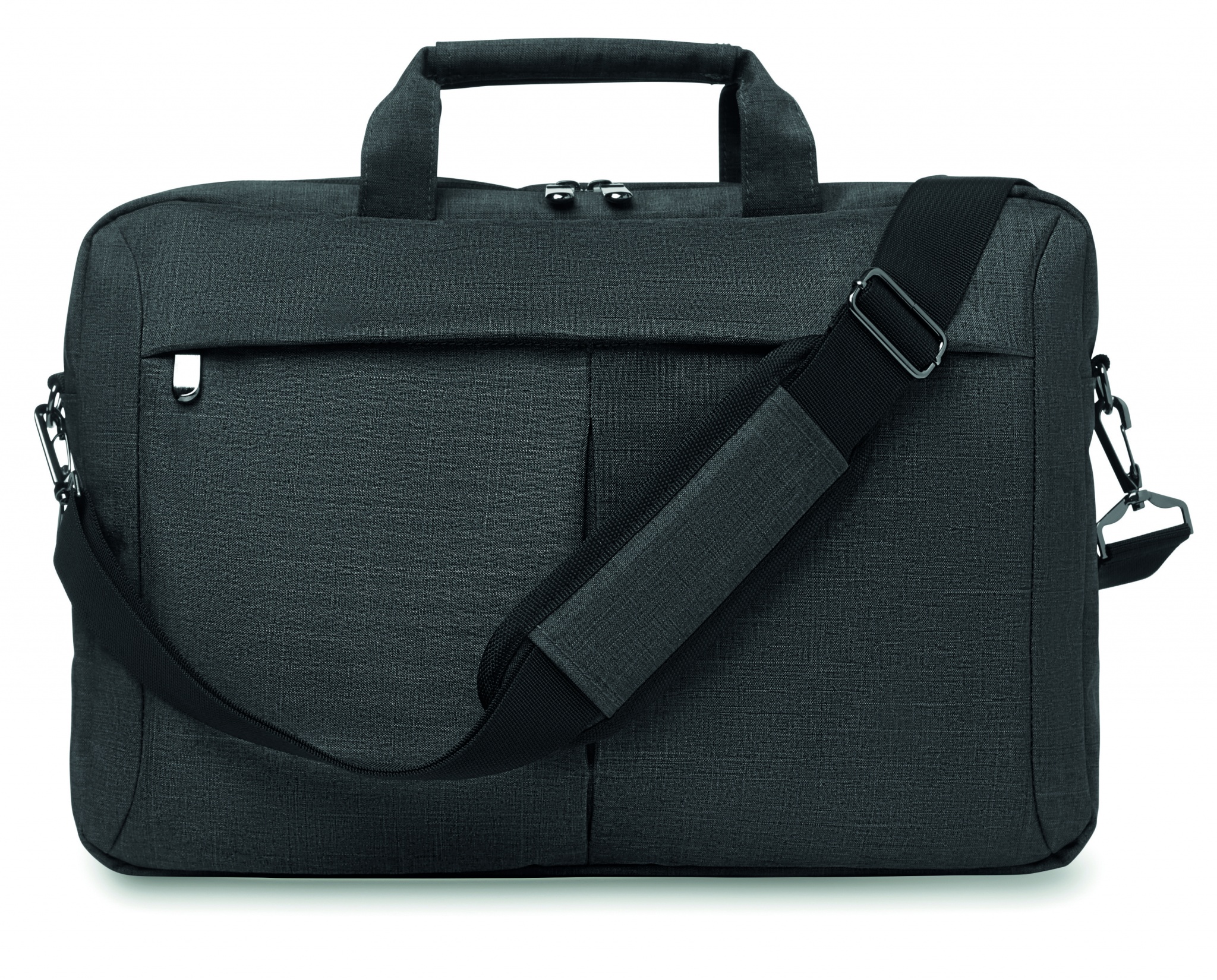 Laptop bag in 360D 2 tone polyester including one main internal compartment for 15 inch laptop and one zippered front pocket. Includes detachable and adjustable shoulder strap. Trolley holder on back side.