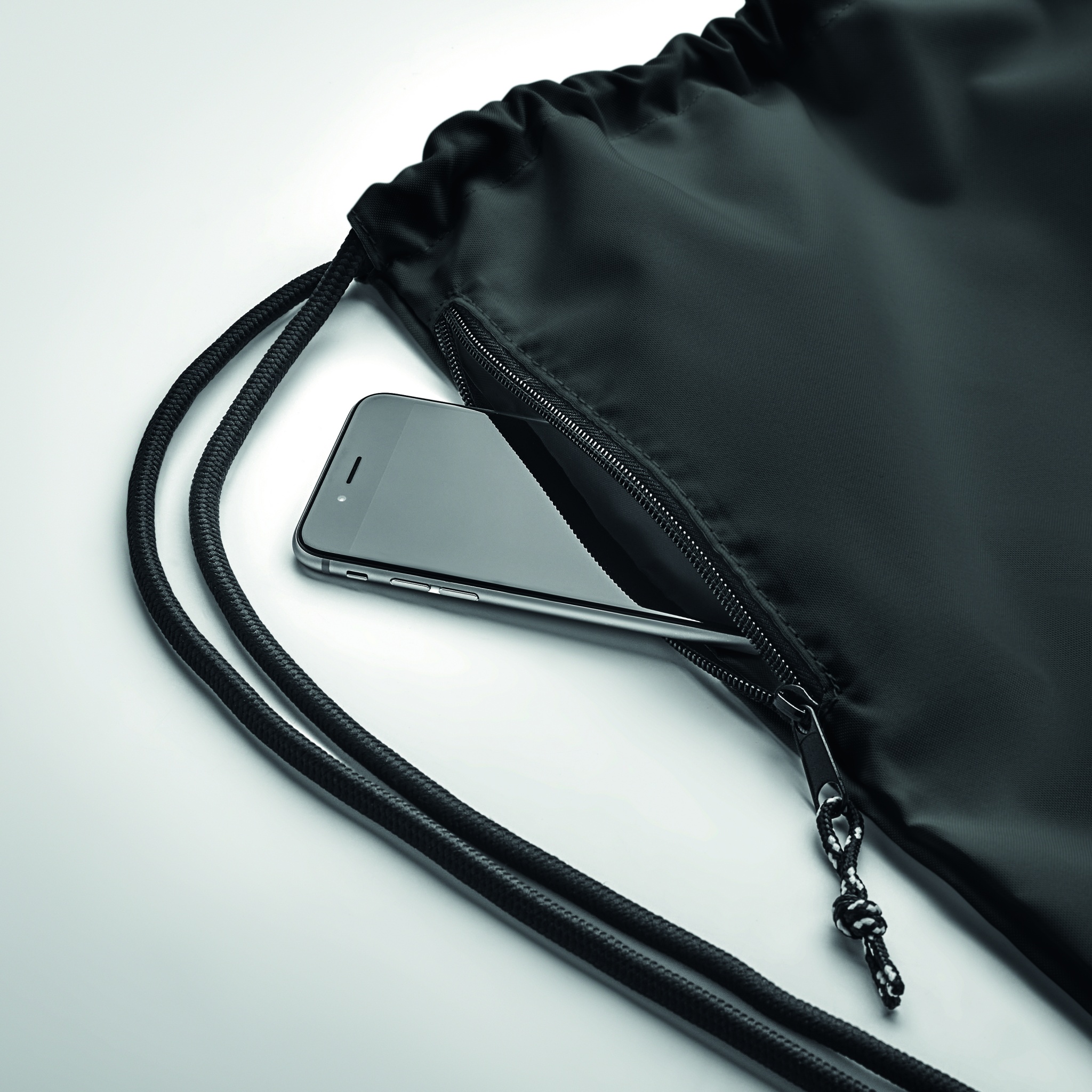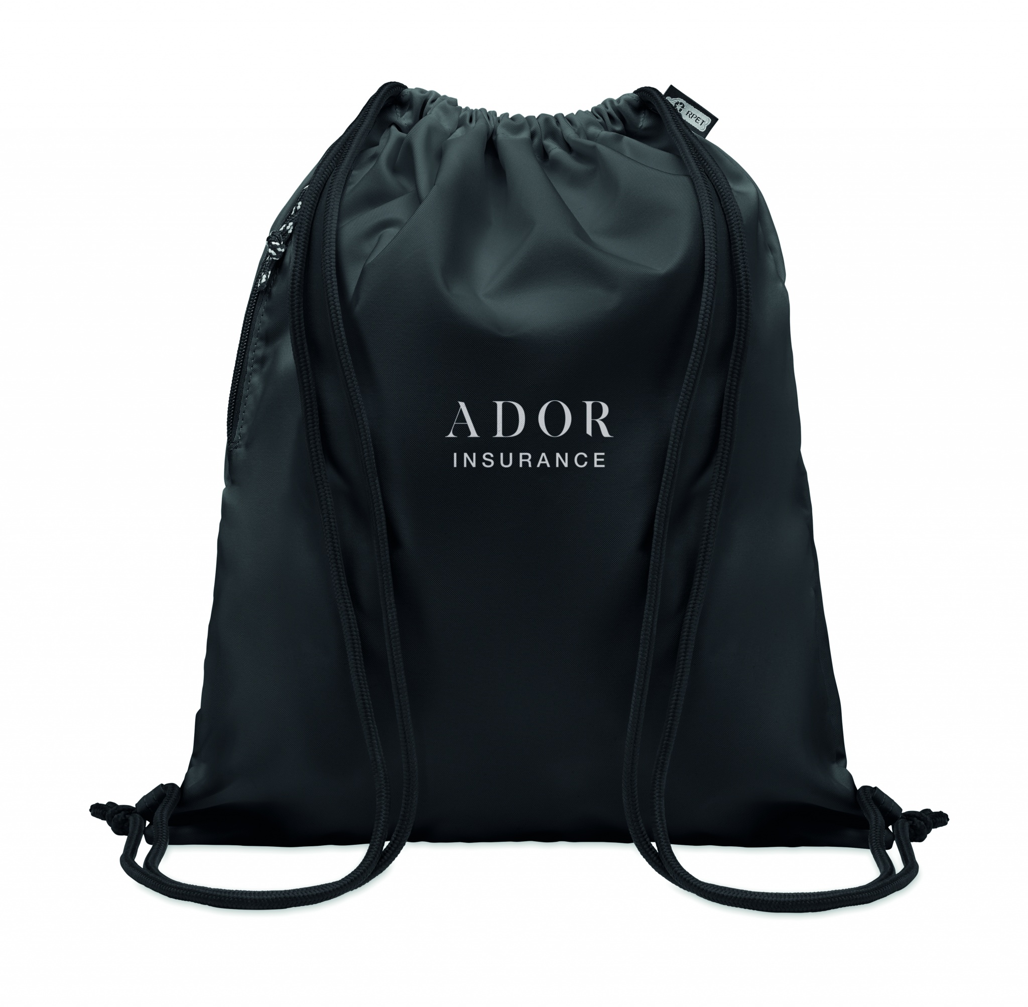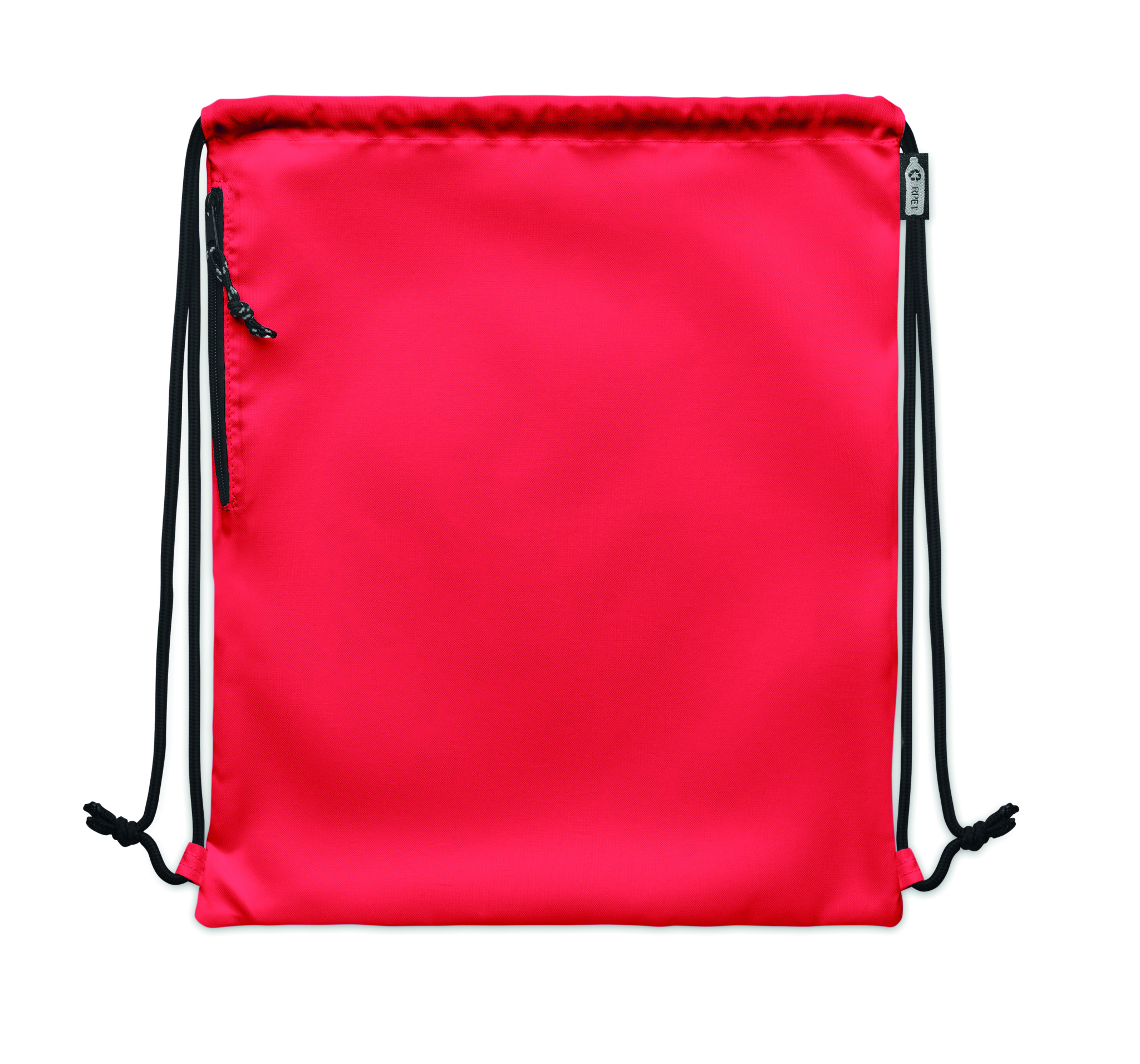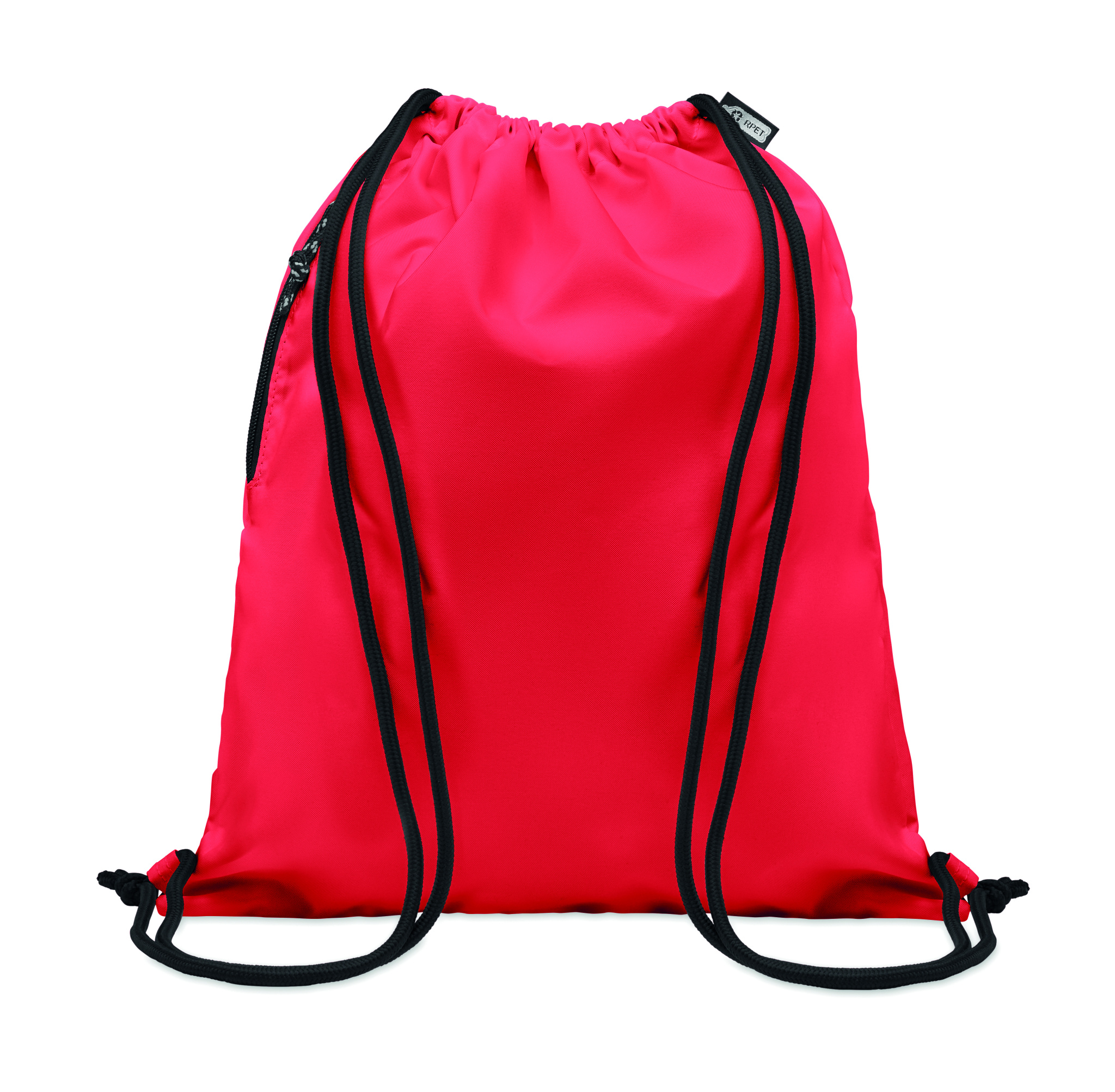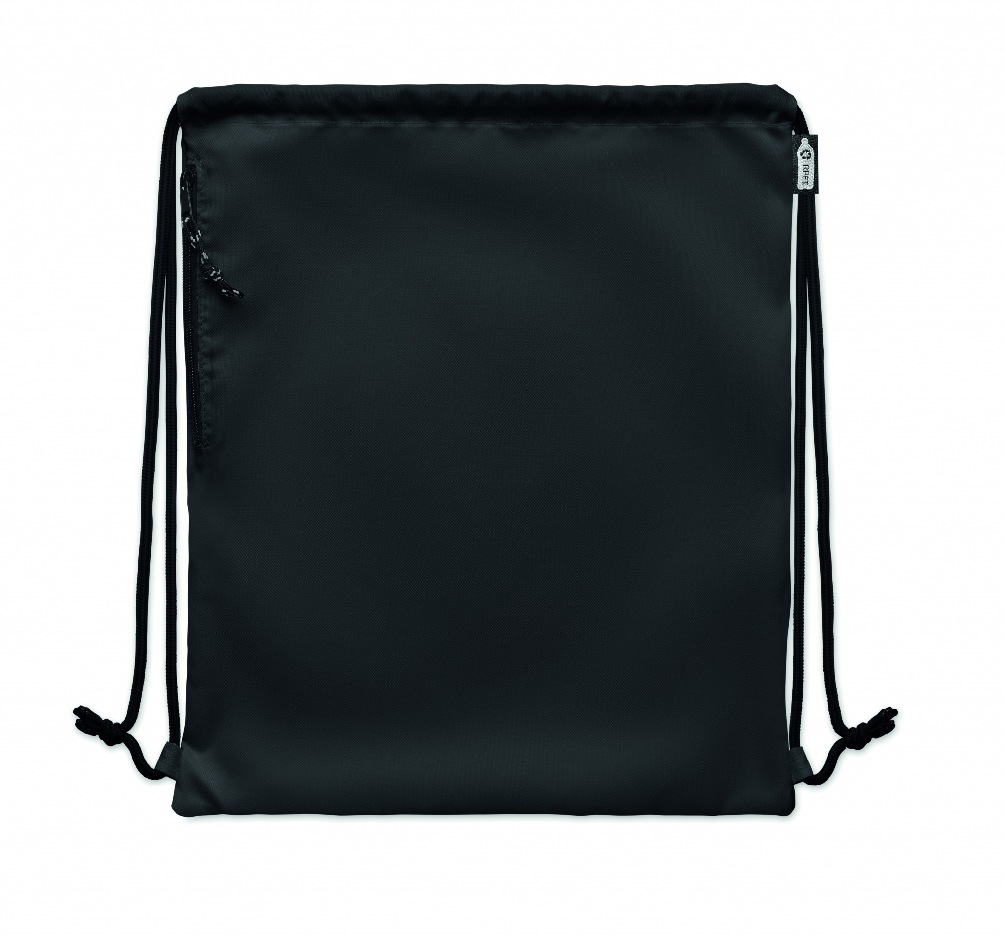 Large drawstring bag in 300D RPET polyester with side zippered outer pocket.