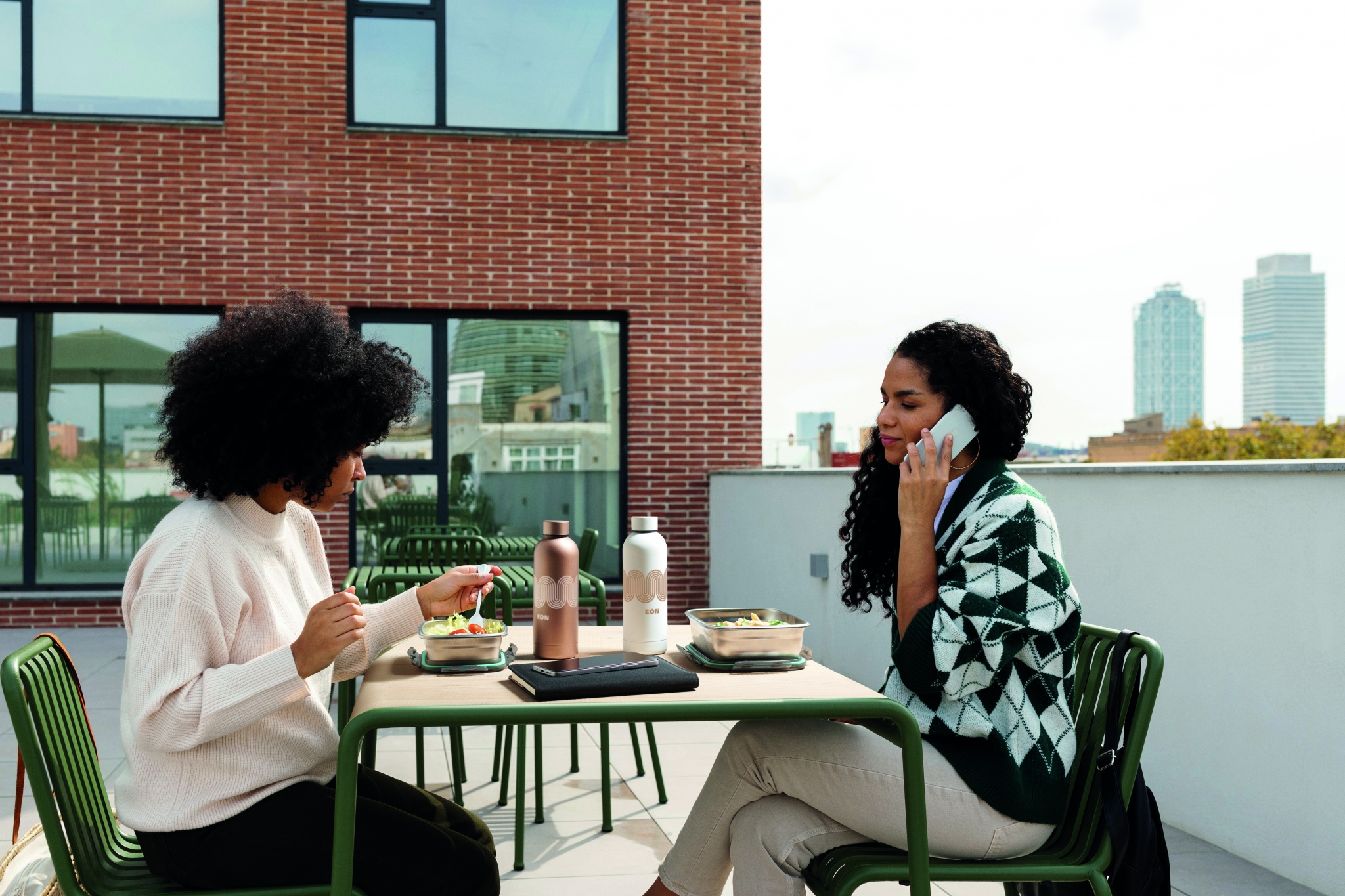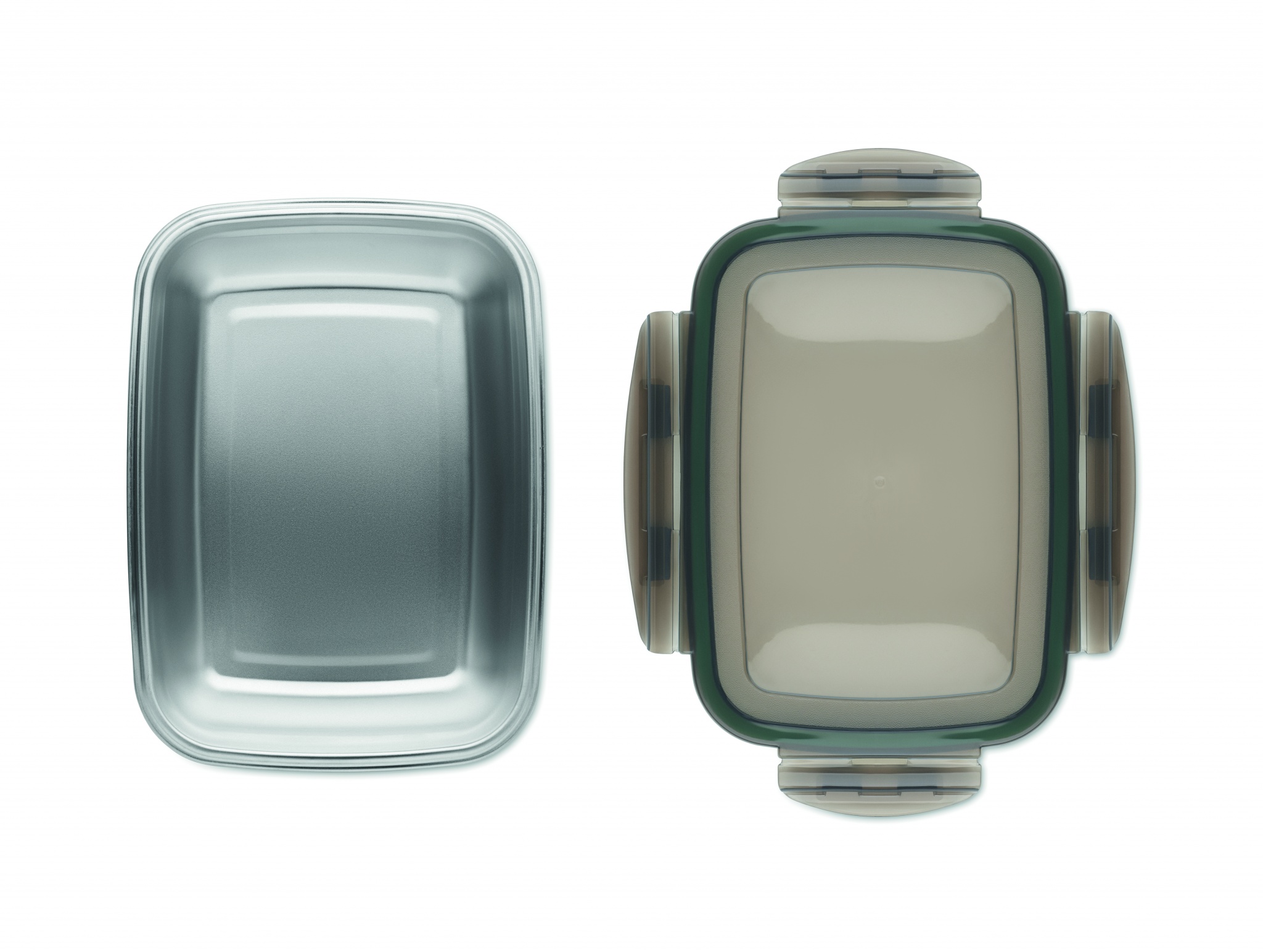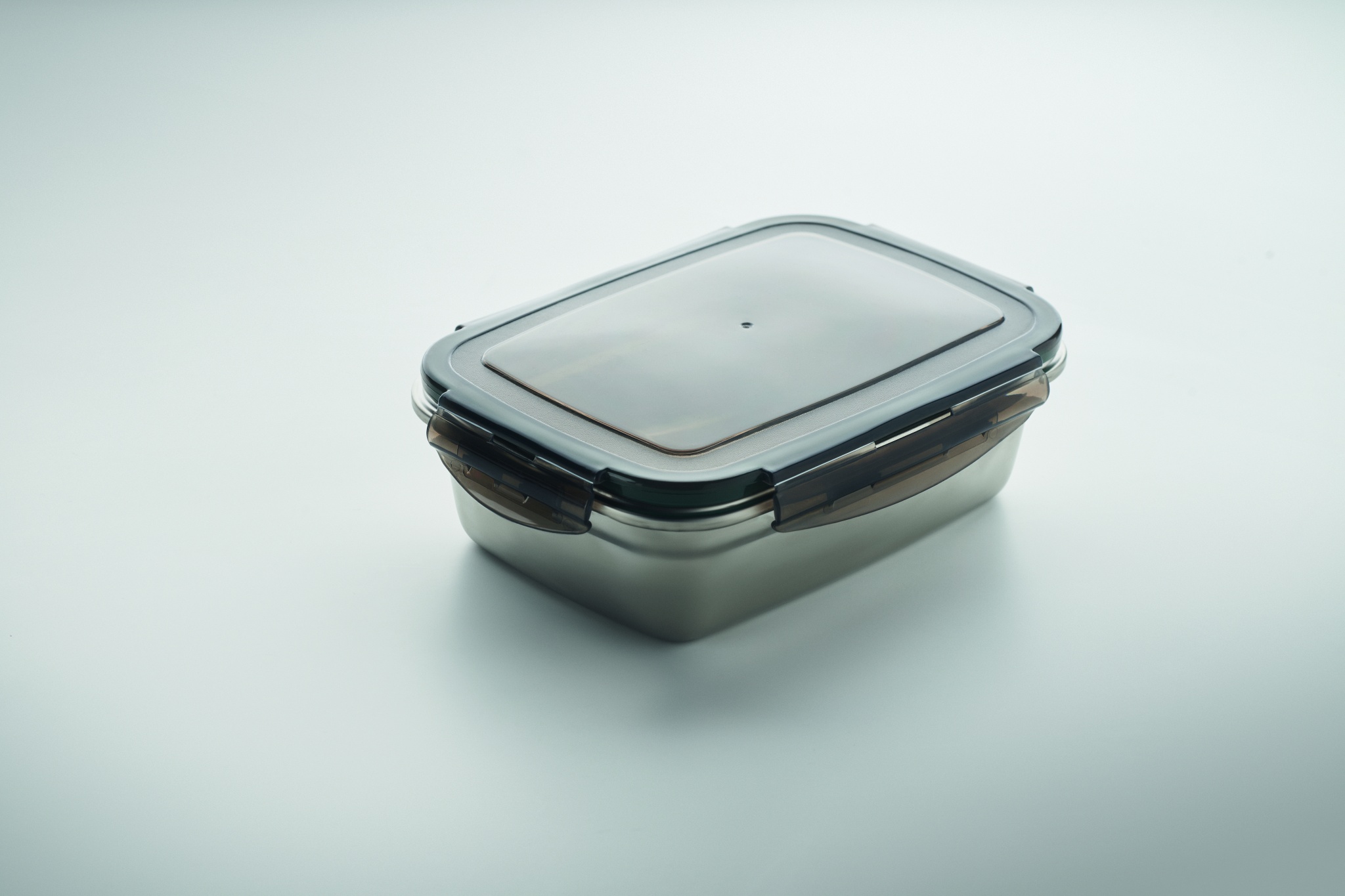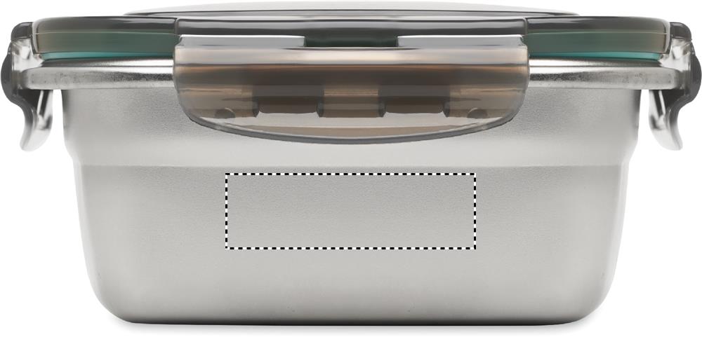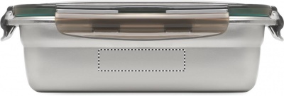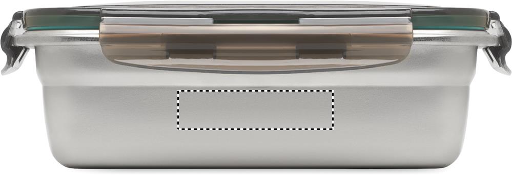 Recycled stainless steel lunch box with recycled PP lid and 4 side clasp closure. Capacity: 850 ml.