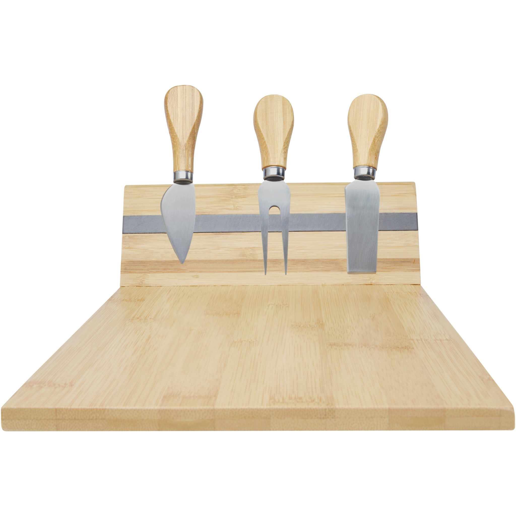 Cheese set made of bamboo with a cheese board (30 x 20.2 x 7.6 cm), 2 cheese knives (12.5 x 2.5 cm and 12.5 x 2.7 cm), and a cheese fork (13.5 x 2.4 cm). On the side of the cheese board there is a magnetic strip to attach the cheese tools, allowing you to serve cheese in style. The bamboo used is sourced and produced following sustainable standards.