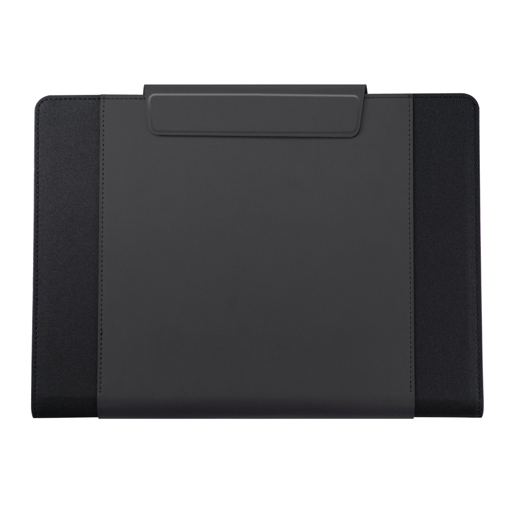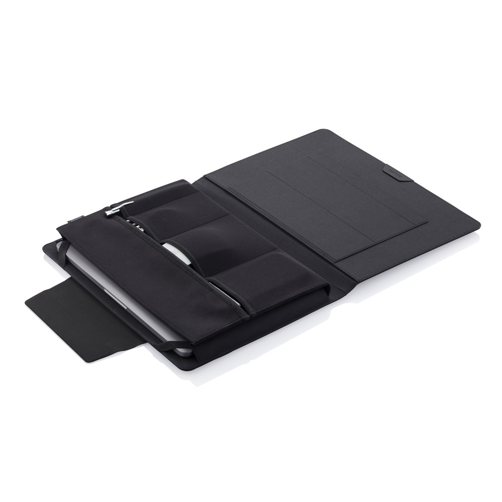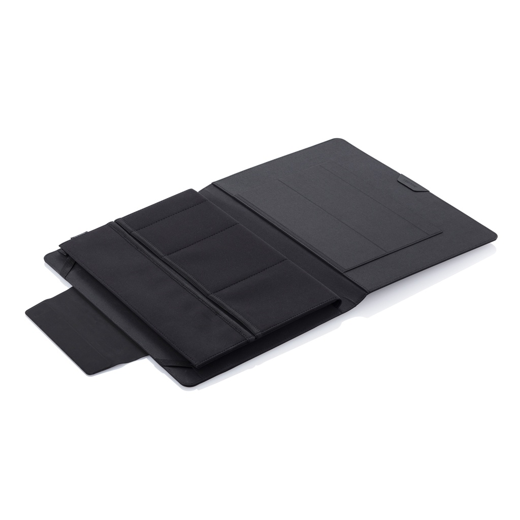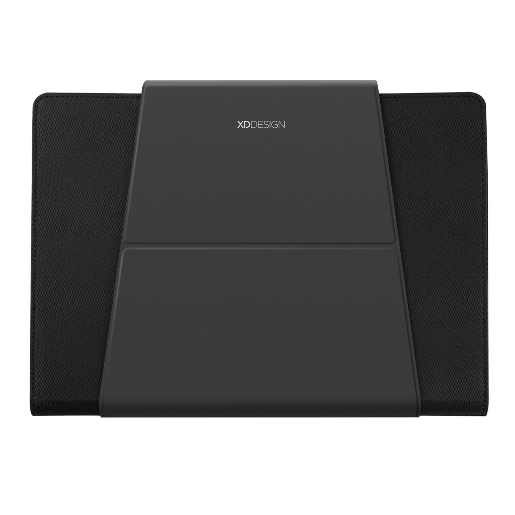 Wherever you go, take your office with you! With an innovative fold-out design, this portable workstation will keep your professional belongings organized and convenient while on the go. Simply unfold and use the magnetic stands to place your laptop in the correct position, or use the inside surface as a mousepad. The mobile office holds a 13" laptop and a tablet up to 12,9". Registered design®