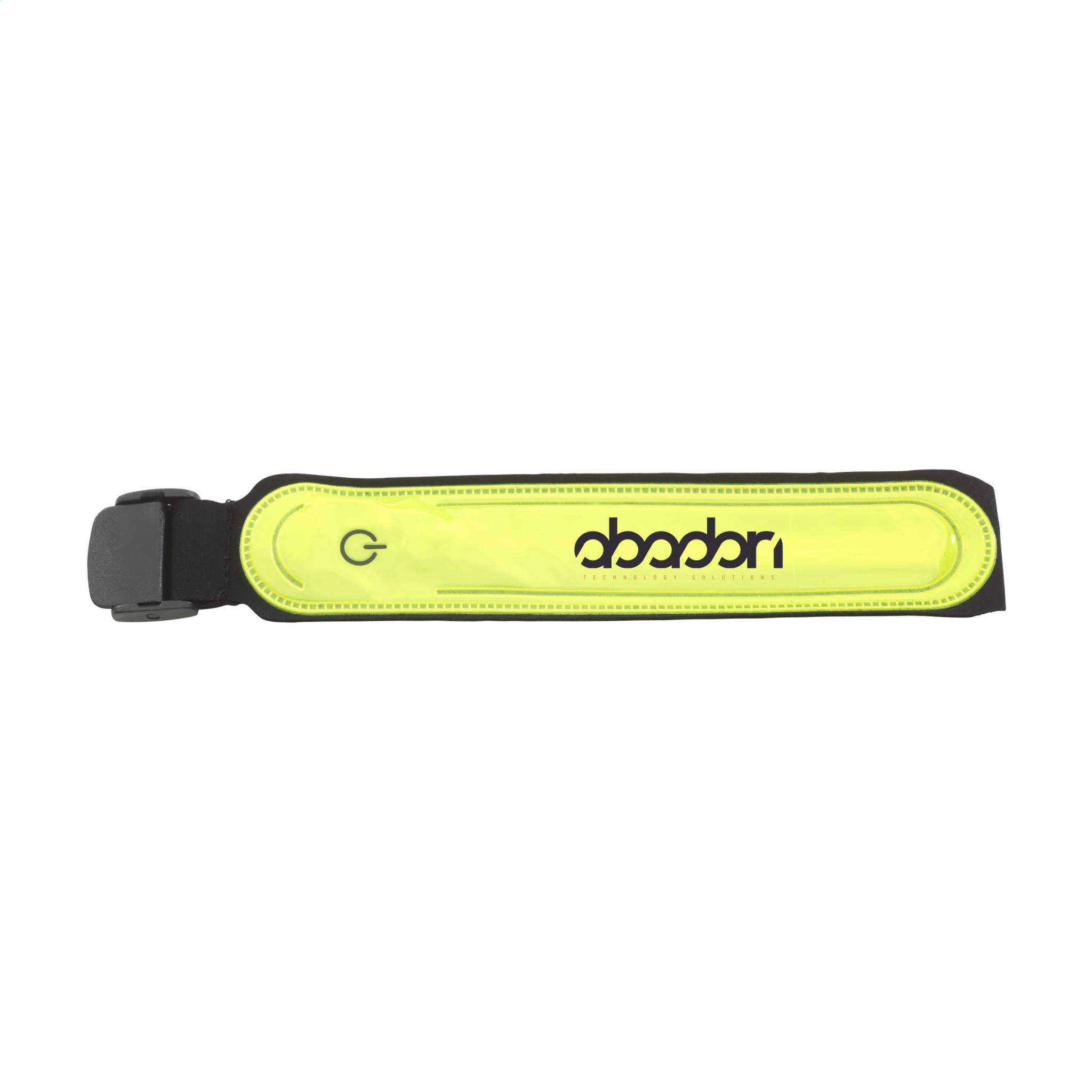 Stay visible with this adjustable, elastic armband with fluorescent strip and LED light. Set to 3 modes: fast flashing, slow flashing or continuous light. With convenient plastic closure. Incl. battery.