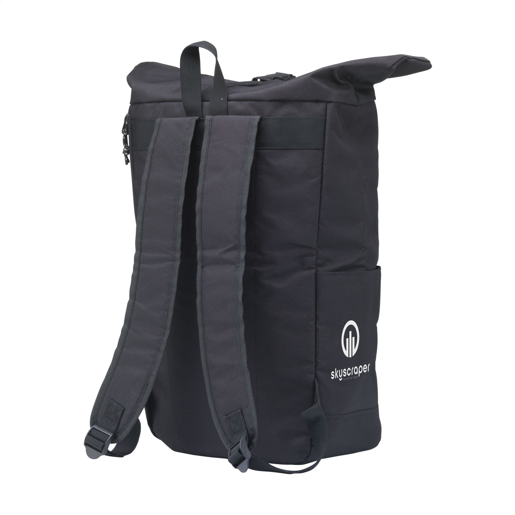 WoW! Practical, sturdy and water-resistant urban 'roll-top' cooler backpack made from RPET polyester. This backpack has a large inner compartment with a special cooling section. The cooling section is easily accessible via the top of the bag or via a practical and waterproof zip at the rear. The ideal bag for outdoor activities, picnics and food delivery. Includes a zip pocket on the front, two side pockets, padded foam back, adjustable shoulder straps, a carrying strap and a roll closure with a handy click system at the top. Capacity approx. 30 litres.