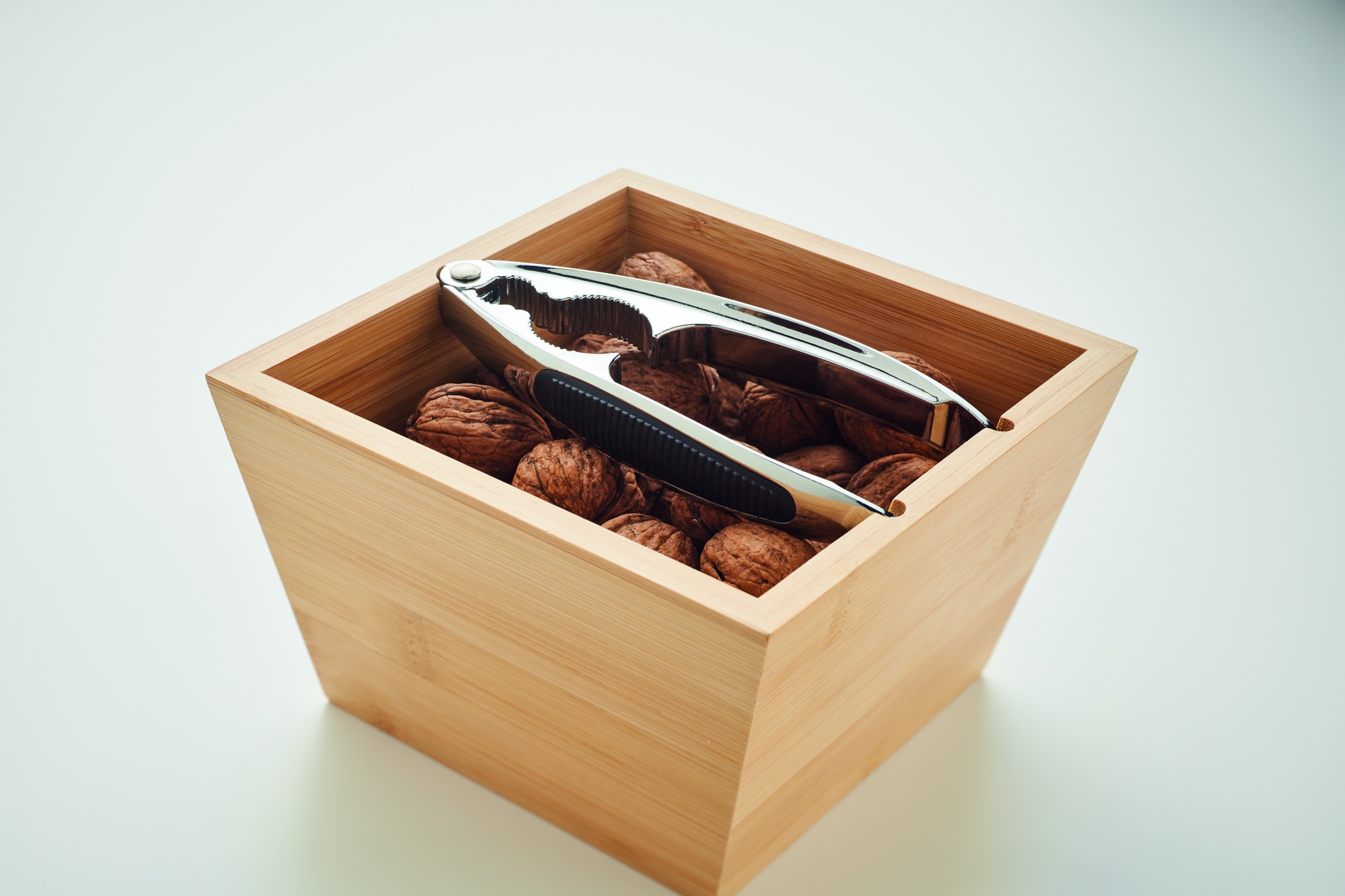 Nut cracker set with bamboo bowl and silver coloured nut cracker in zinc alloy with TPR grip. Bamboo is a natural product, there may be slight variations in colour and size per item, which can affect the final decoration outcome.