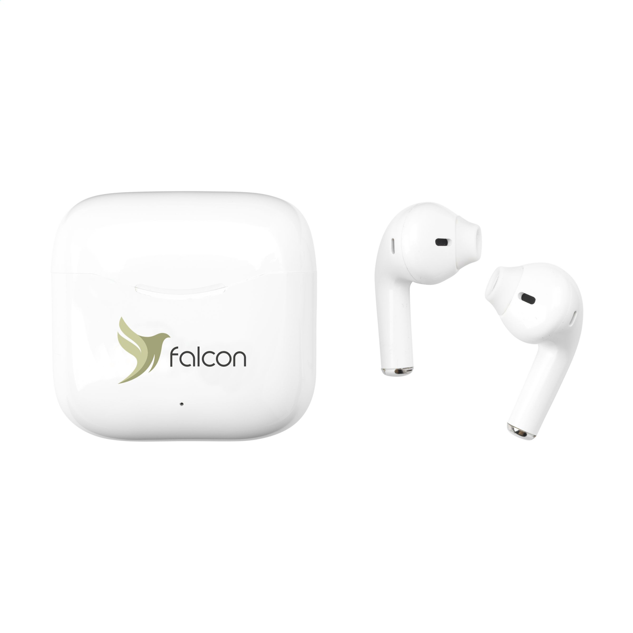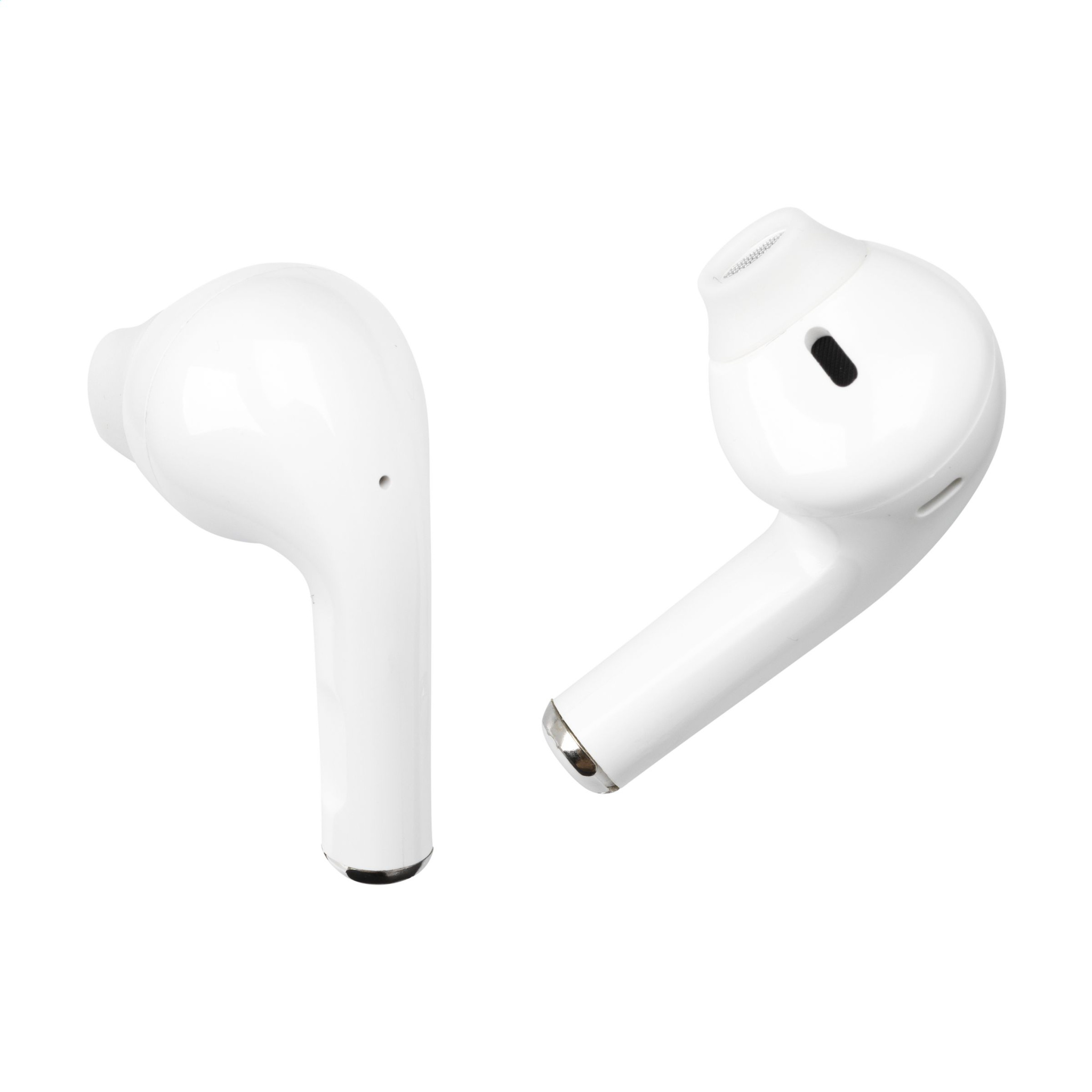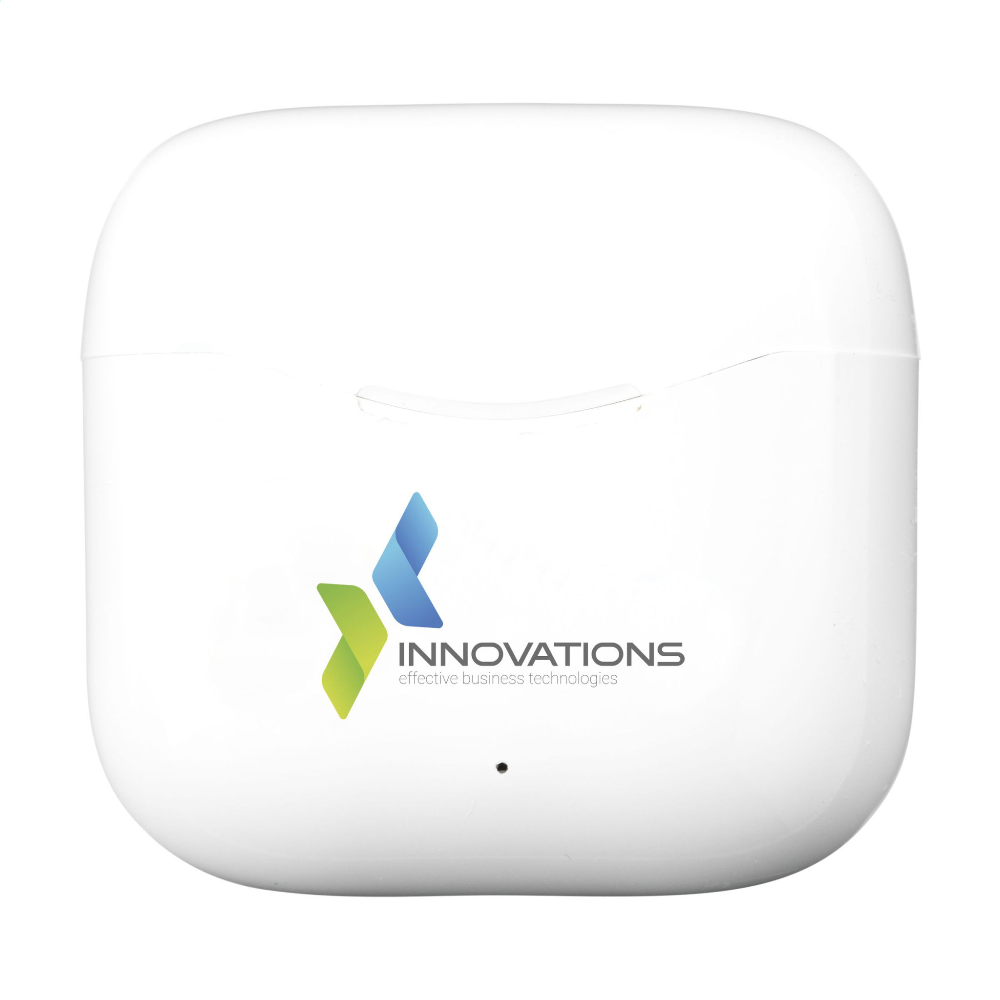 Next generation true wireless earphones in charging case made from recyced ABS. These earphones use BT 5.1 for a smooth connection. The earphones have a 30mAh battery and take only one hour to charge with the 200mAh charging case. Excellent sound reproduction and adjustable volume is coupled with autopairing technology providing automatic pairing and touch control. Easily make hands-free phone calls and enjoy music without restrictive cables. Connection has a 10-meter range. Includes a PVC-free charging cable type-C and user manual. RCS-certified. Total recycled material: 62.5%. Each item is individually boxed.