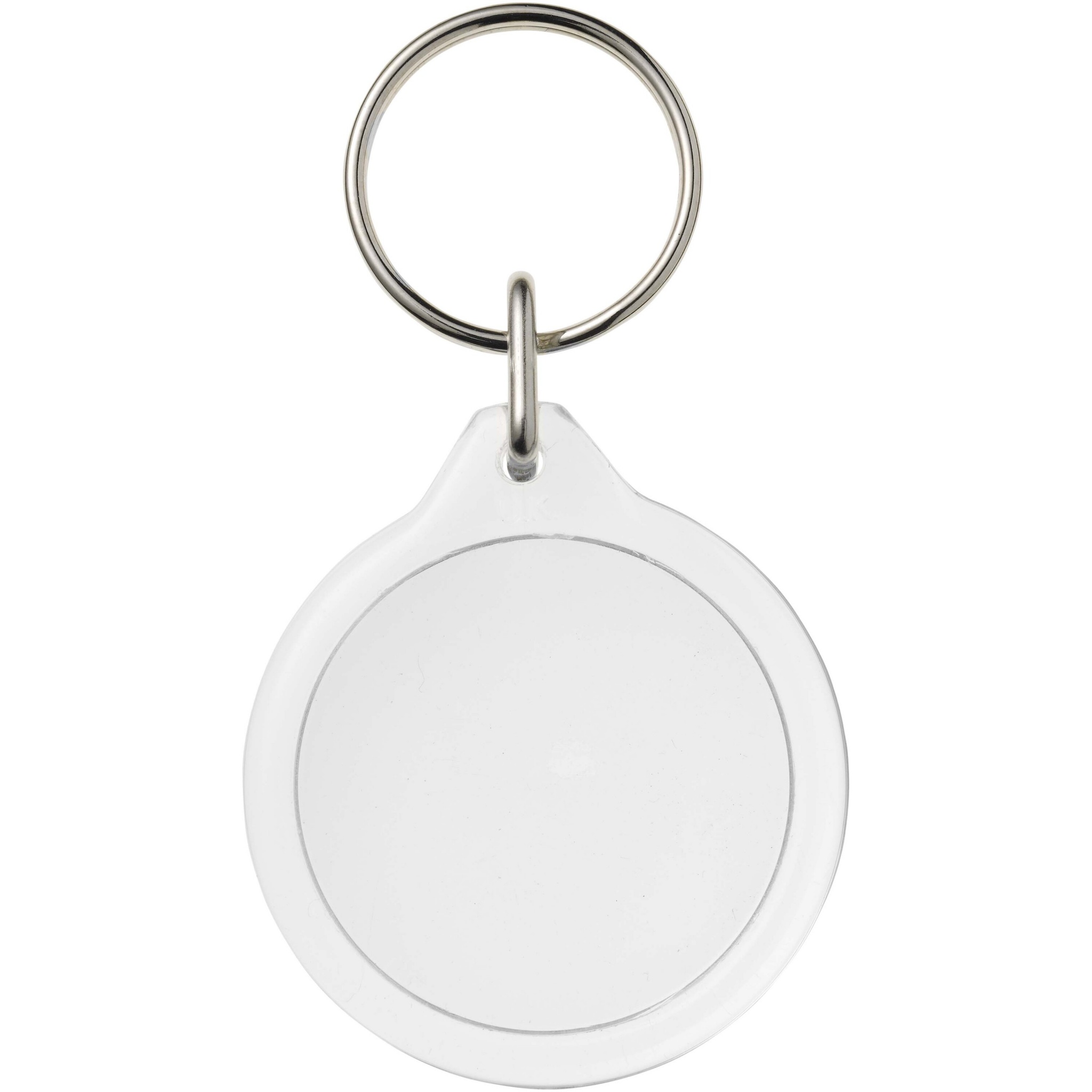 Clear I7 round keychain with metal split keyring. The metal looped ring offers a flat profile which is ideal for mailings. Print insert diameter: 3,3 cm.