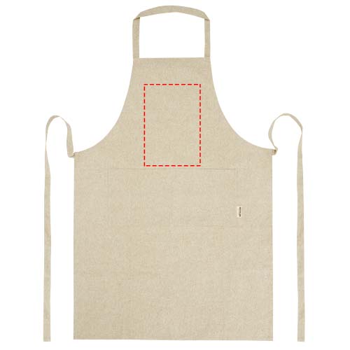 Apron made of 200 g/m² recycled cotton polyester blend. Features 2 adjacent pockets with a combined size of 45 x 20 cm, and a 1 metre tie back closure. Recycled cotton is manufactured from pre-consumer waste generated by textile factories during the cutting process. Due to the nature of recycled cotton, there may be a very slight colour variation. This feature distinctly adds to a more authentic appearance. Length of the neck strap: 55 cm.