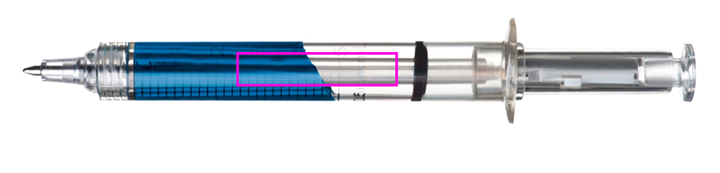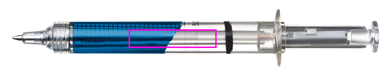 Gag pen in the shape of a syringe, with blue or red plastic writing refill. We will print your logo in black, opposite to the scale.