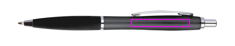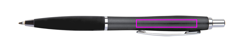 Slim plastic ballpen with blue-writing plastic refill and rubberized grip zone. Your logo will be printed below the clip.