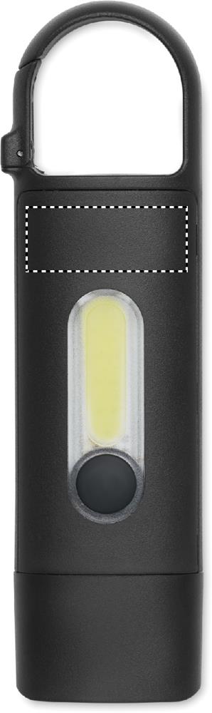 Pocket-size Rechargeable COB flash light with carabiner hook in ABS. Emergency light and 3 lighting modes. 1 × 3.7V, 200 mAh Lithium rechargeable battery (included, non-replaceable).