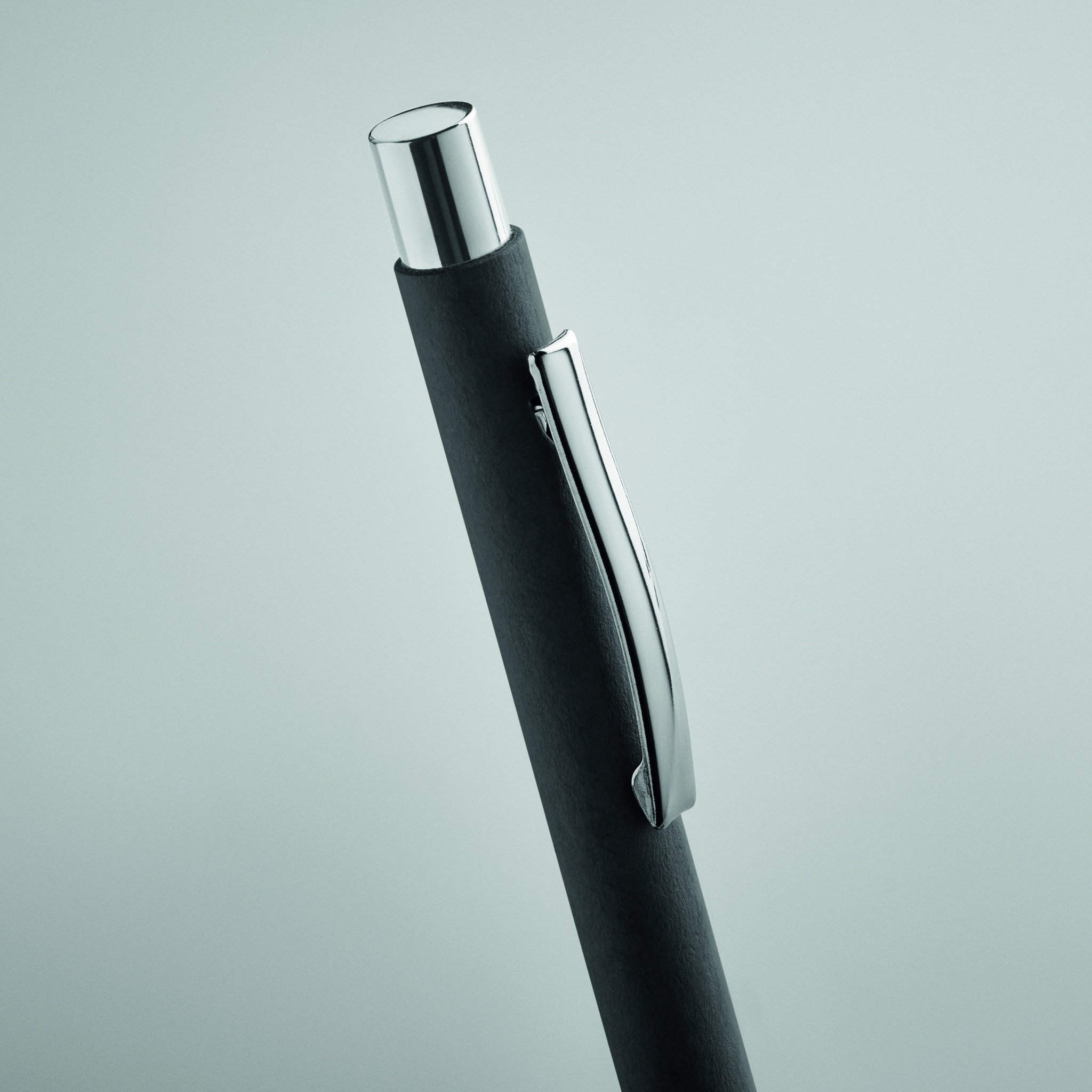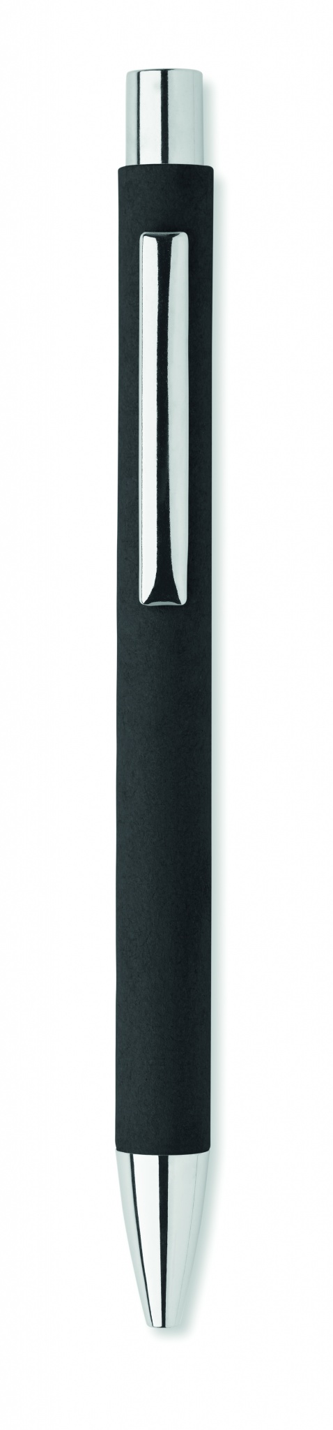 Push button ball pen in recycled paper and metal clip and plastic fittings. Blue ink.